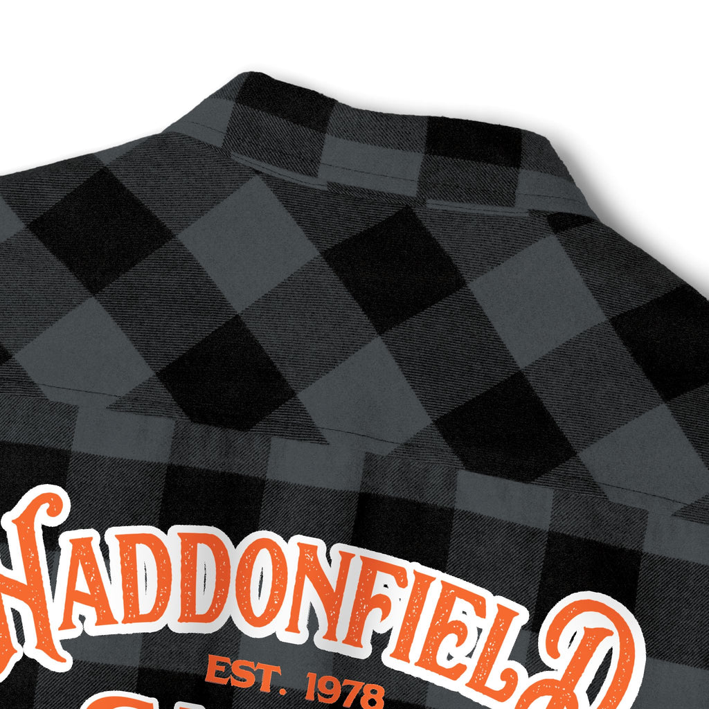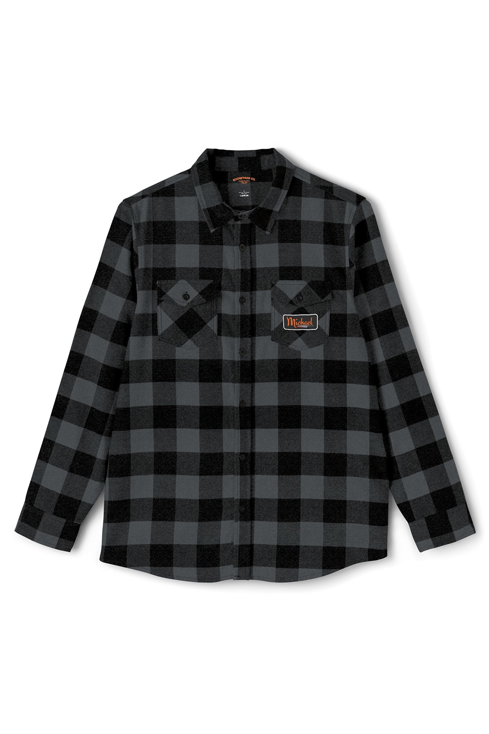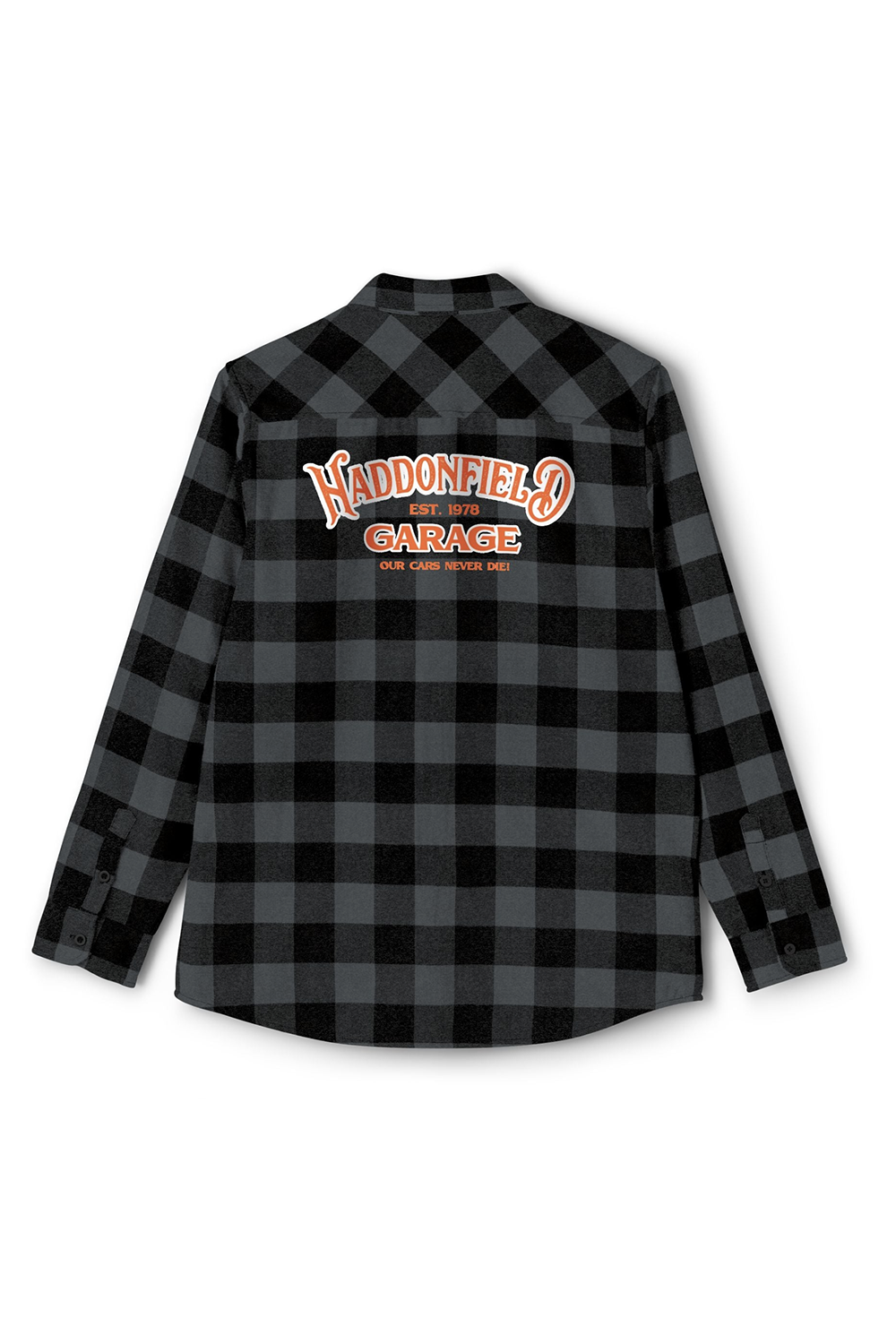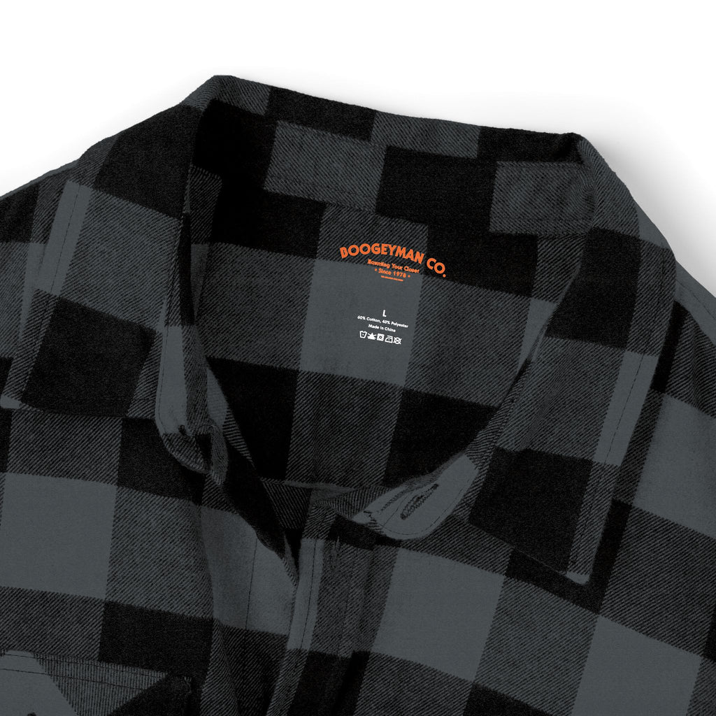 Take your car to Haddonfield Garage - our cars never die! This comfy flannel features our custom Haddonfield Garage logo on the back and a Michael patch printed on the front left pocket.