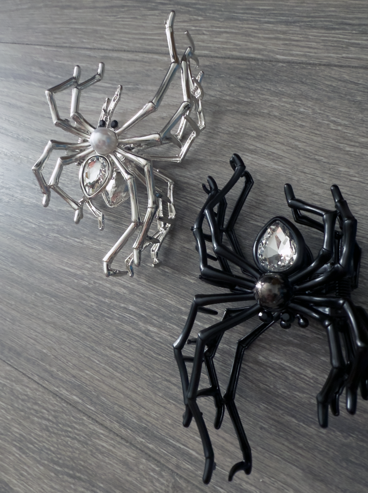 Our new hair claw clip is perfect for the spooky babes! Featuring a large spider with rhinestone details. This claw clip is made out of metal and is sturdy and will hold all your hair no problem!
