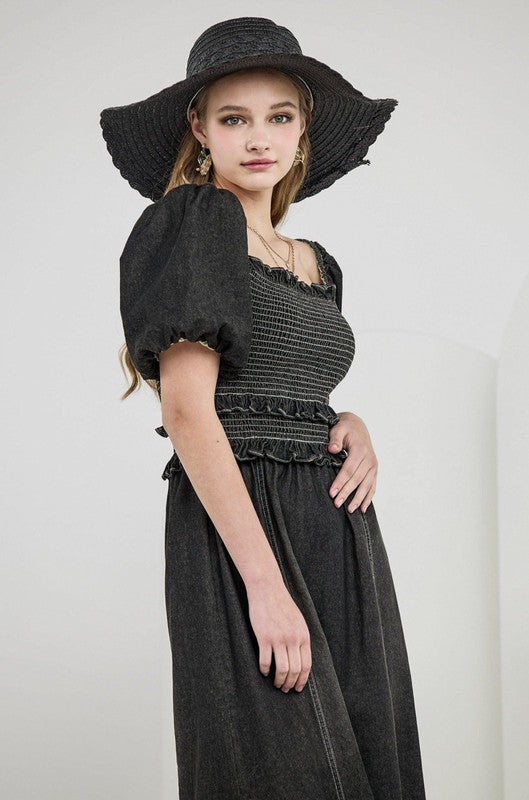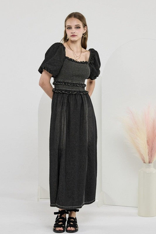 Introducing our Boho Summer Casual Denim Off Shoulder Puff Short Sleeve Smocked Flowy A-Line Beach Long Maxi Dress with Slit. This exquisite piece, crafted from high-quality medium-washed cotton, is naturally breathable and soft to the touch, ensuring comfort all day long. The dress showcases a