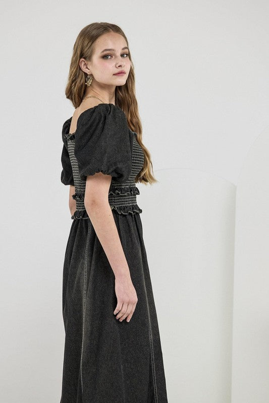 Denim Off Shoulder Puff Sleeves Smocked Dress
