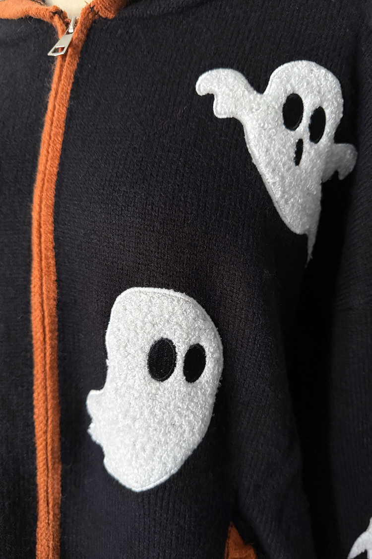 This fun cardigan features flying ghosts chenille appliques on a black knit sweater with orange contrast trim. So cute and oh so cozy!