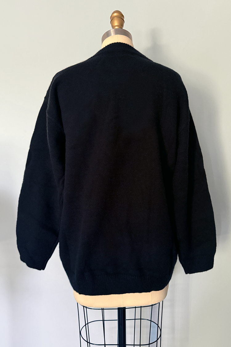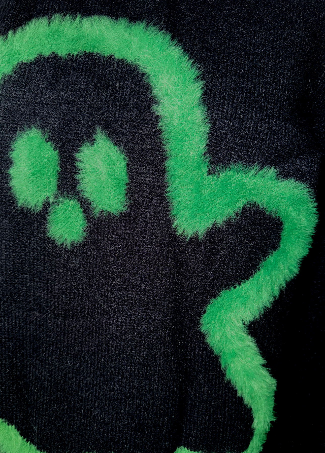 Our new Ghoulish Ghost sweater is perfect for spooky season! With a fun green ghost knit on the front of this black sweater, you'll be cozy and creepy!