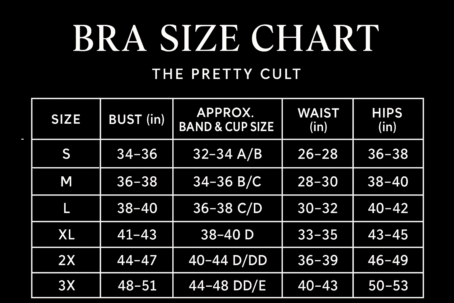 | Size | Bust (in) | Approx. Band & Cup Size | Waist (in) | Hips (in) |
