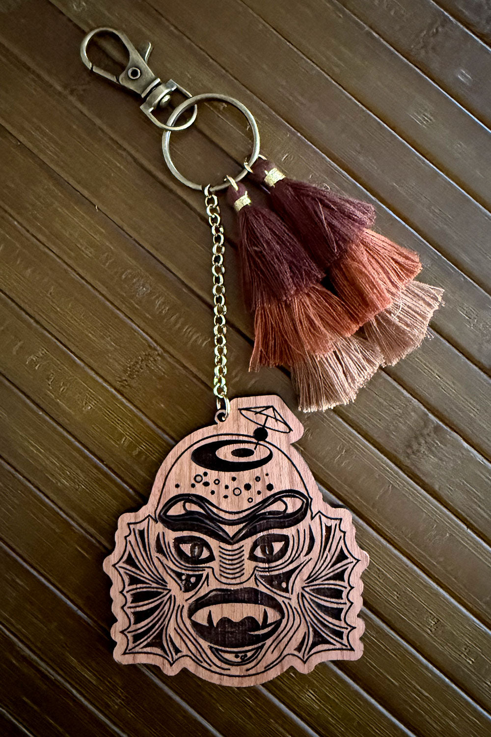 Introducing our very own custom keychains! We make these in house at the TOBS headquarters. These are custom made to order from cherry wood and engraved with our exclusive Swamp Creature Tiki Mug art on the front and Exotikee logo on the back. It also comes with 3 tan and brown tassels on an antique brass keychain.