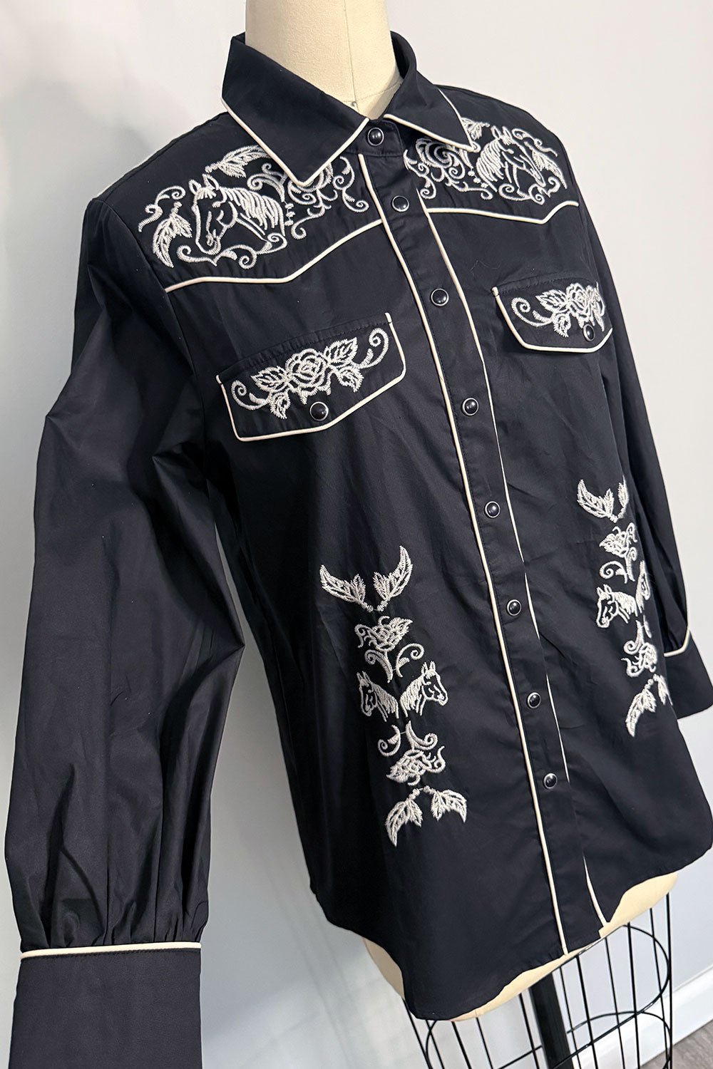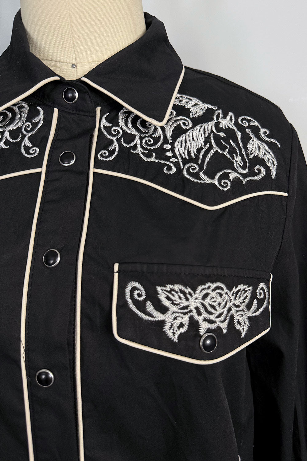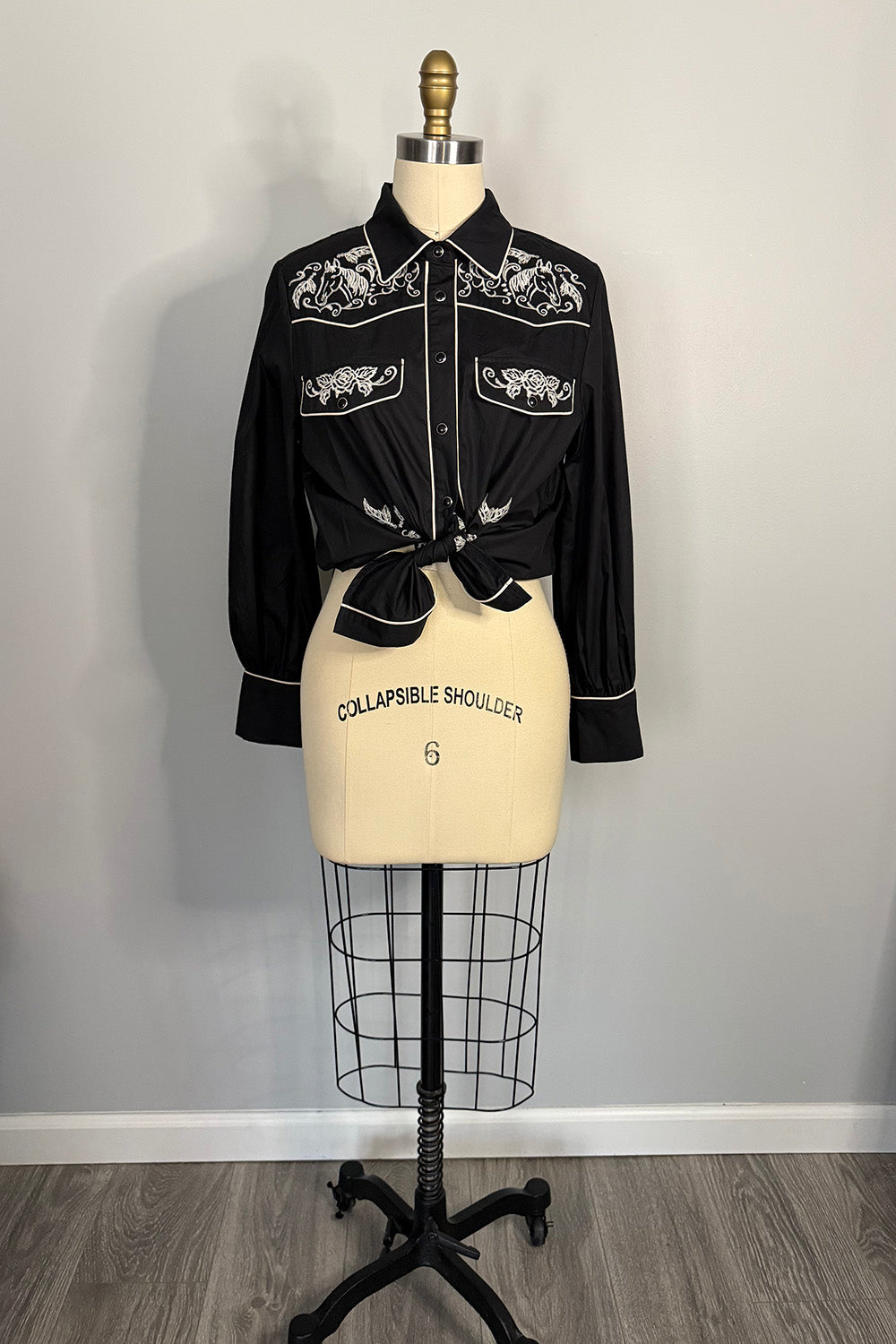 Yee Haw~ you'll be the cutest cowgirl on the ranch in our new black western button down shirt! Featuring ivory embroidery on the front and back with contrast ivory piping. Tie it up or wear it down for a comfortable fit! This shirt runs big so size down for a tighter fit.