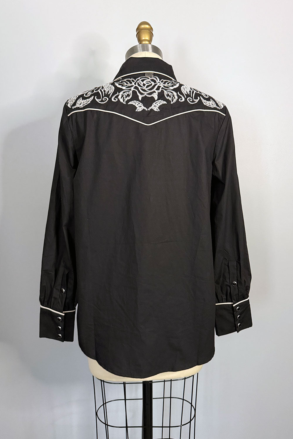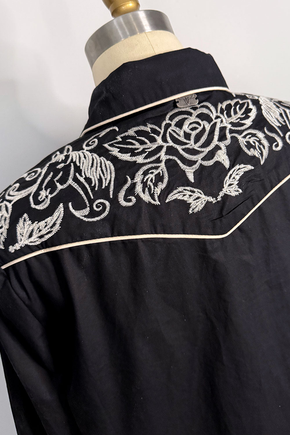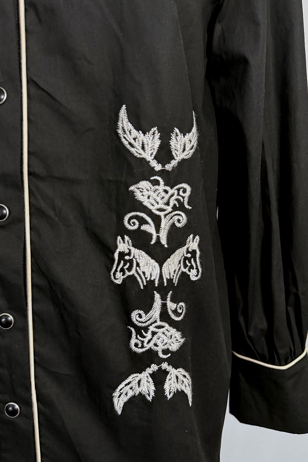 Yee Haw~ you'll be the cutest cowgirl on the ranch in our new black western button down shirt! Featuring ivory embroidery on the front and back with contrast ivory piping. Tie it up or wear it down for a comfortable fit! This shirt runs big so size down for a tighter fit.