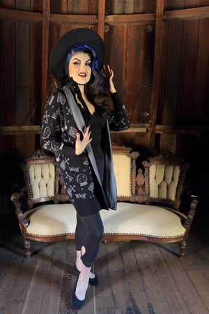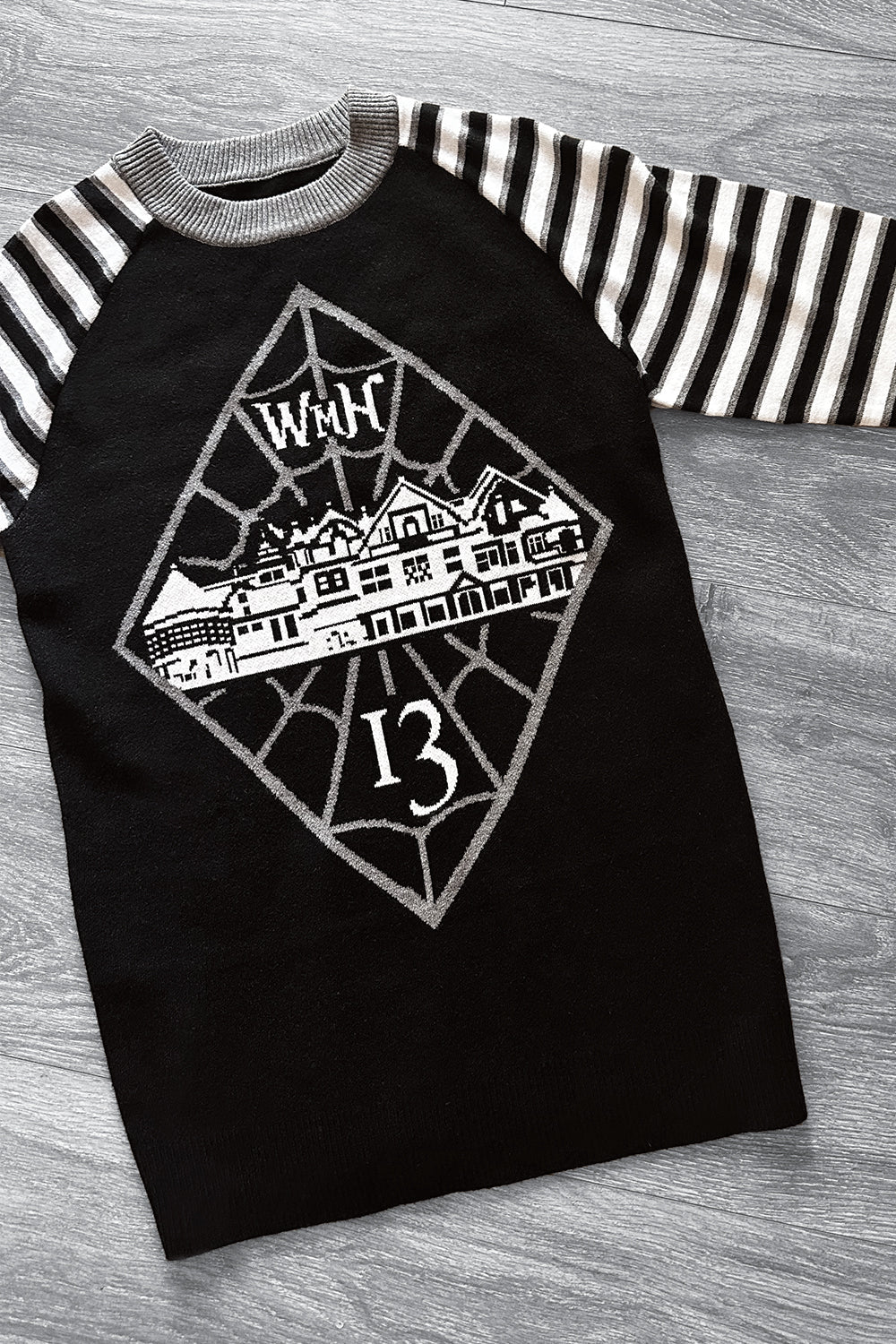 This spooky sweater features a custom knit design of the Winchester Mystery House®, a spiderweb, 13 and WMH on the front. With 3/4" length sleeves, this sweater Is cozy and perfect for a visit to the house this Halloween. Grey, black and white knit design.