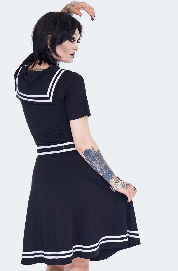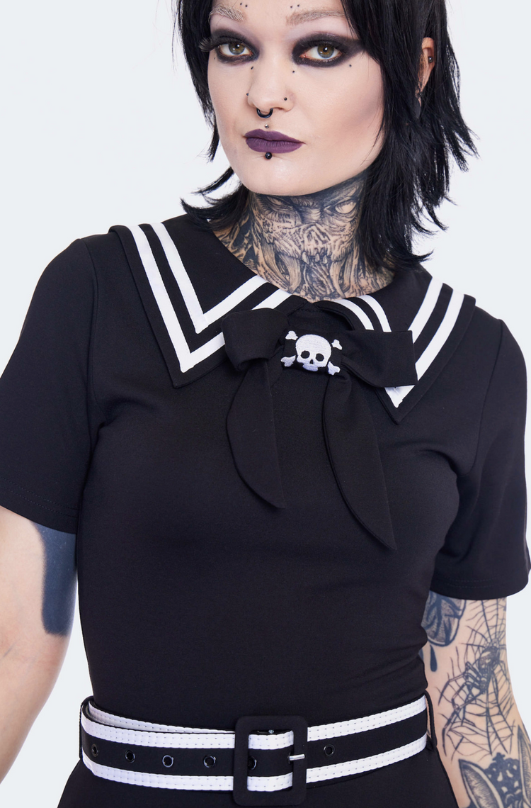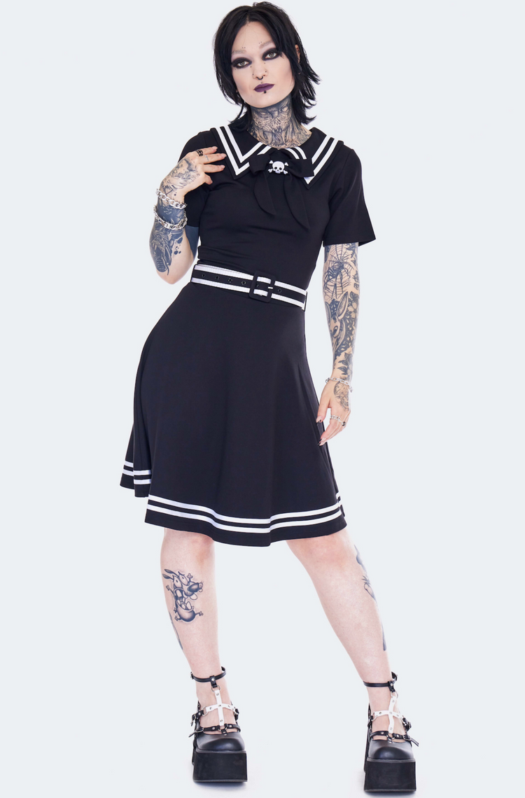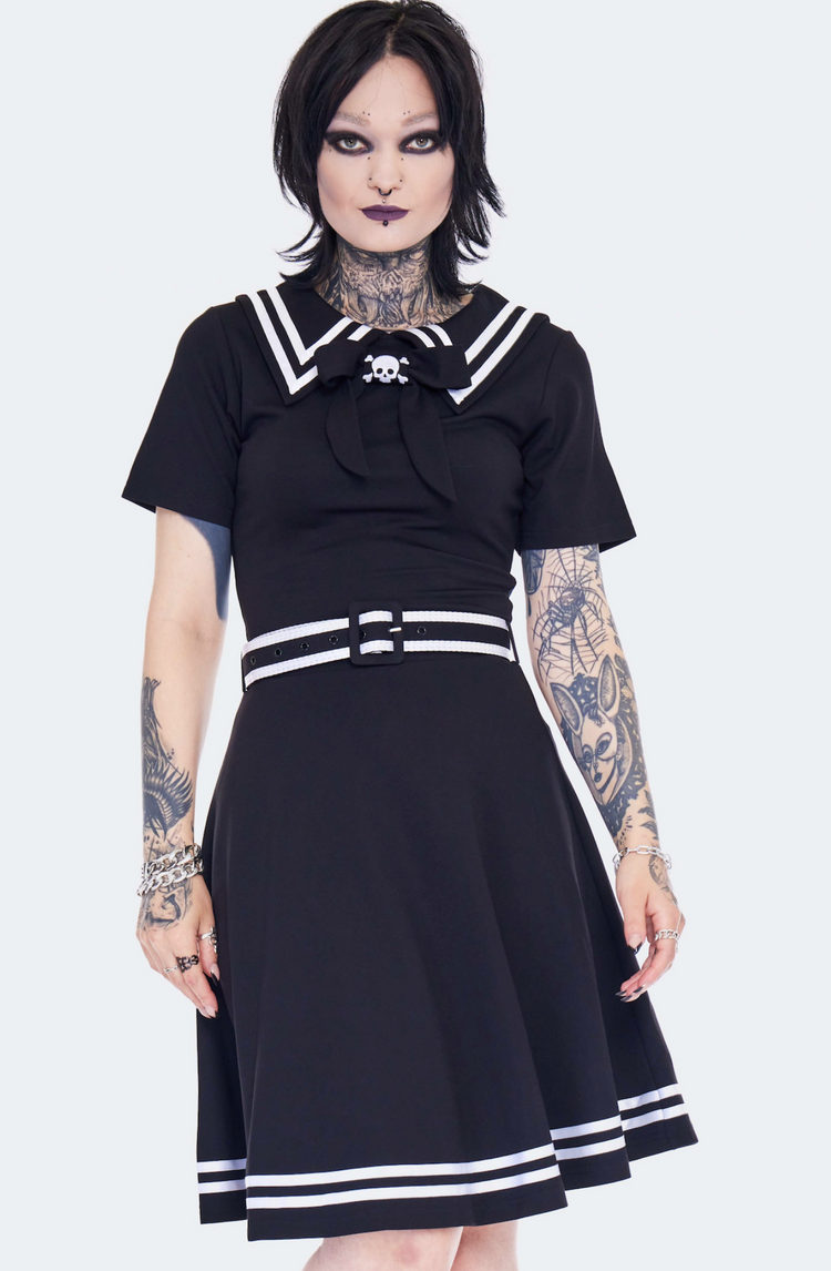 This fabulously spooky sailor babe dress features gothic nautical vibes and a playful skater style, made with a stretchy jersey knit fabric. It's adorned with an oversized sailor collar, embroidered skull and crossbones neck tie, and contrasting white trim. Plus, it comes with a striped buckle belt for the finishing touch!