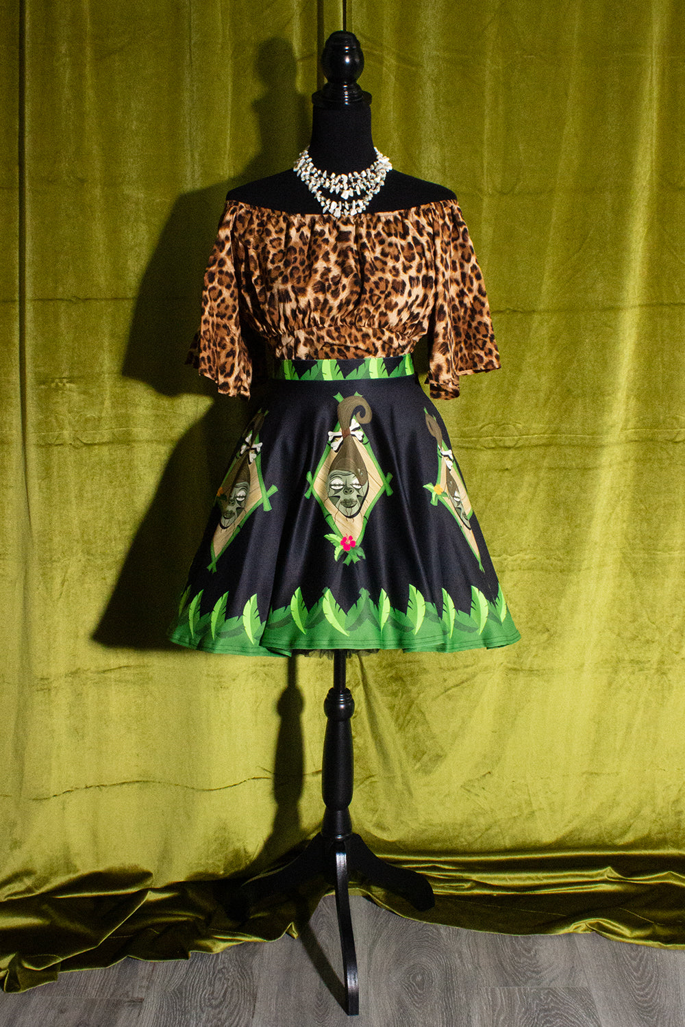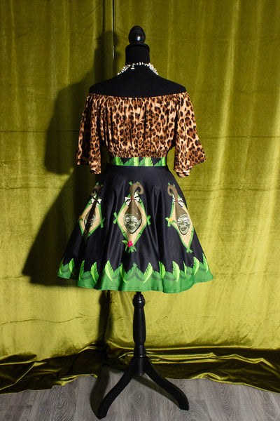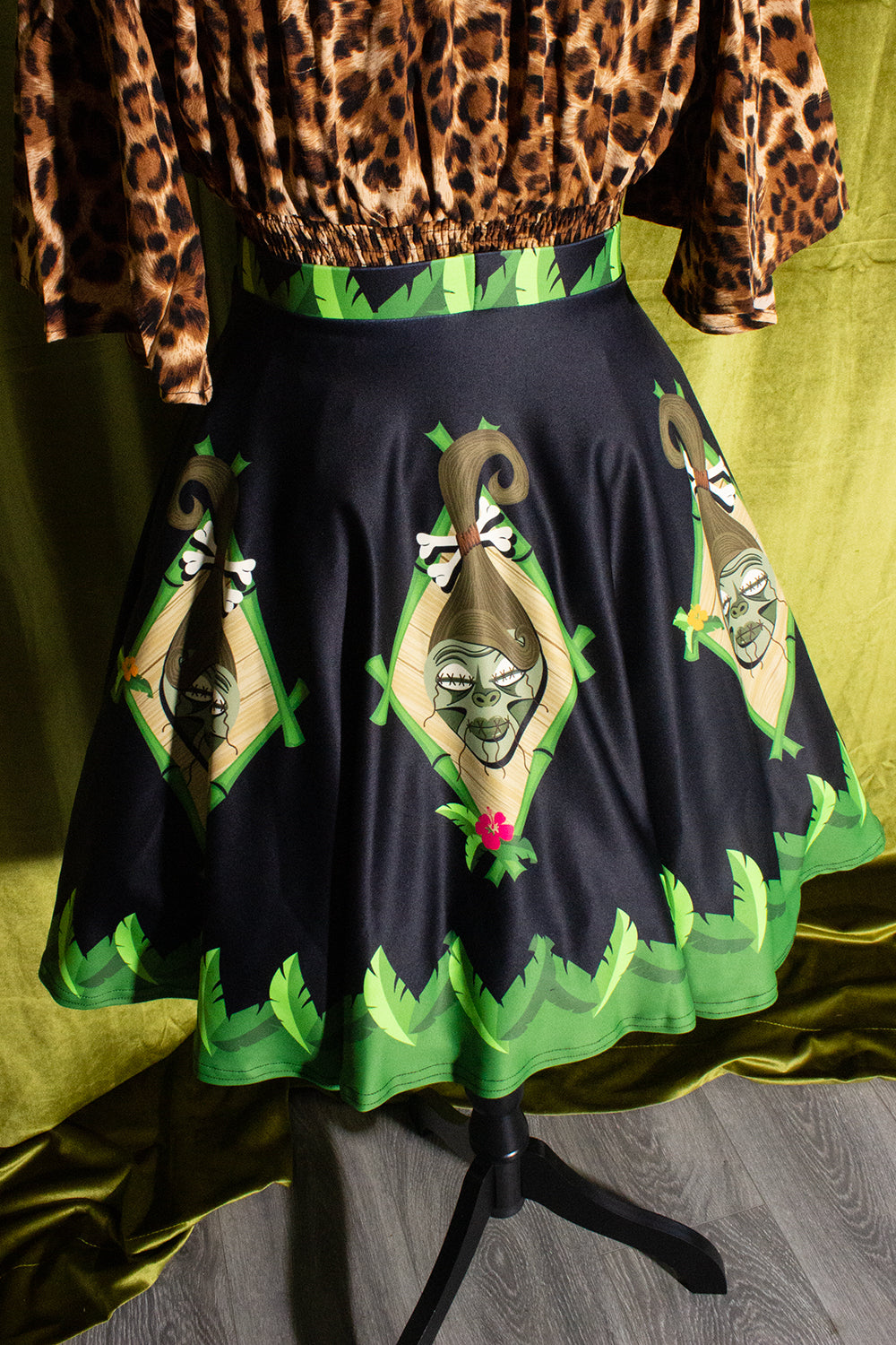 Our Shrunken Head skirt is the perfect flirty skirt for any tiki enthusiast! Featuring our custom artwork on super soft and stretchy poly fabric. With a stretchy waistband you will be comfortable all night long at the tiki bar! Available in sizes XS-3X.