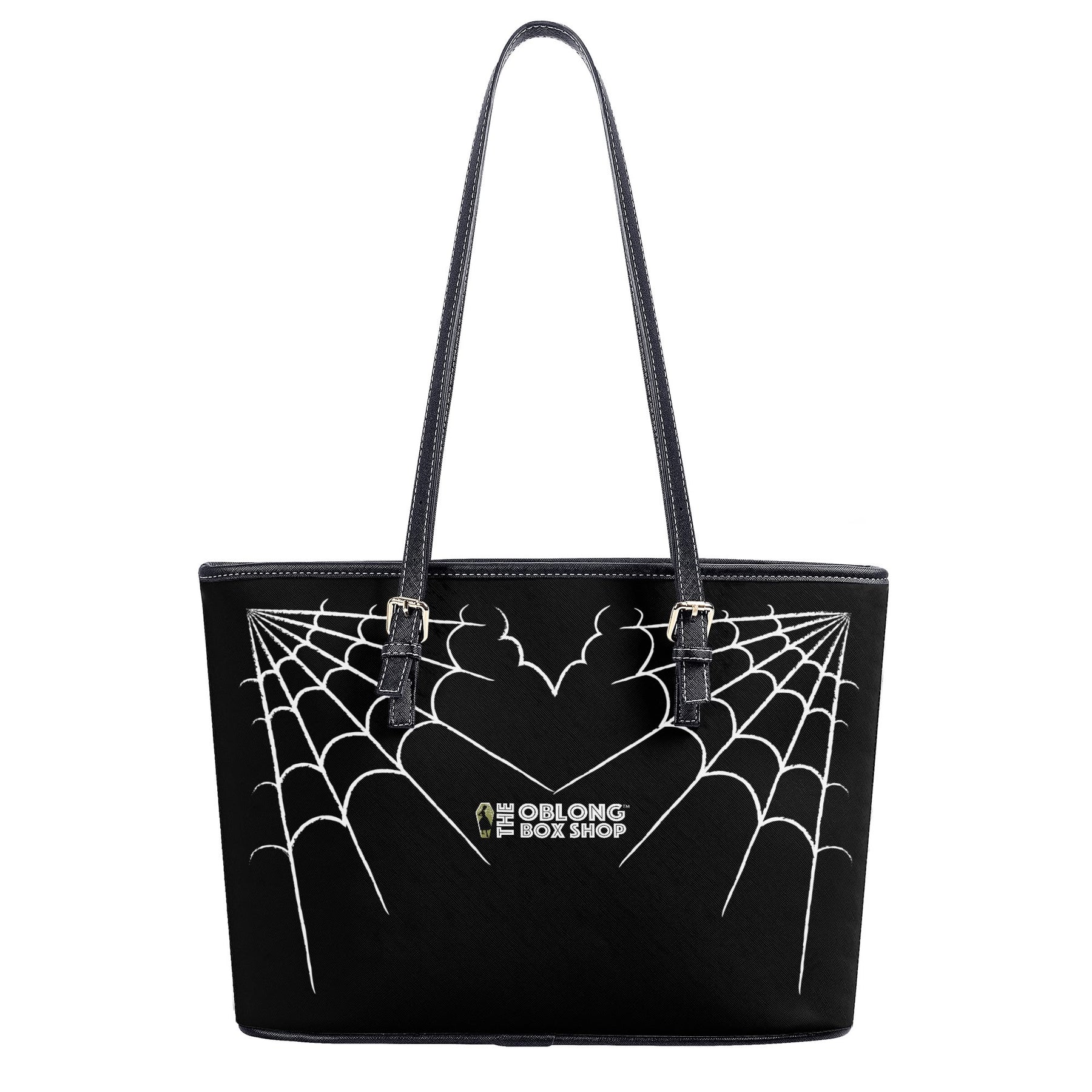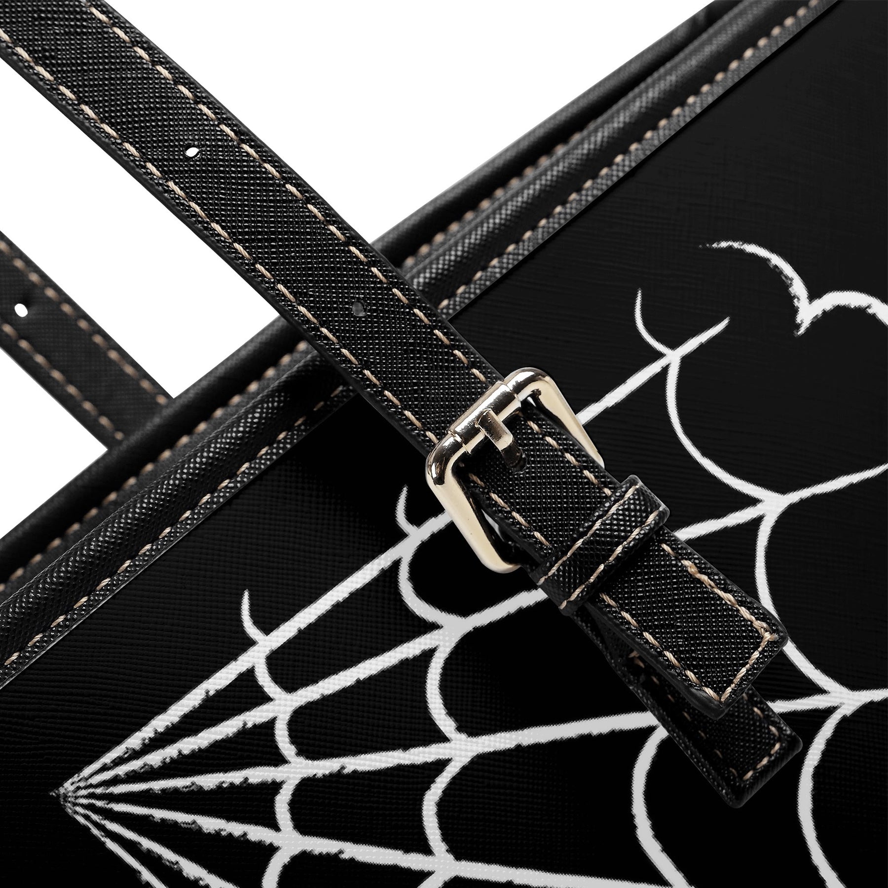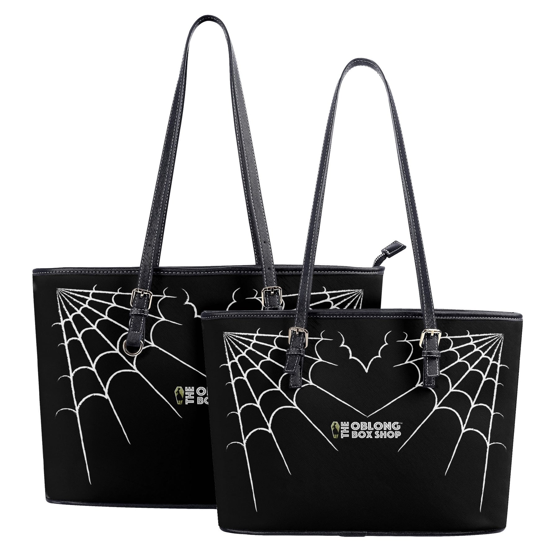 Our very popular Webs of Delight design is now available on a tote bag! Featuring high quality PU leather - faux leather - this bag comes in 2 sizes! With black background and white webs printed on the front and back - there's a ton of room inside for all your spooky essentials!