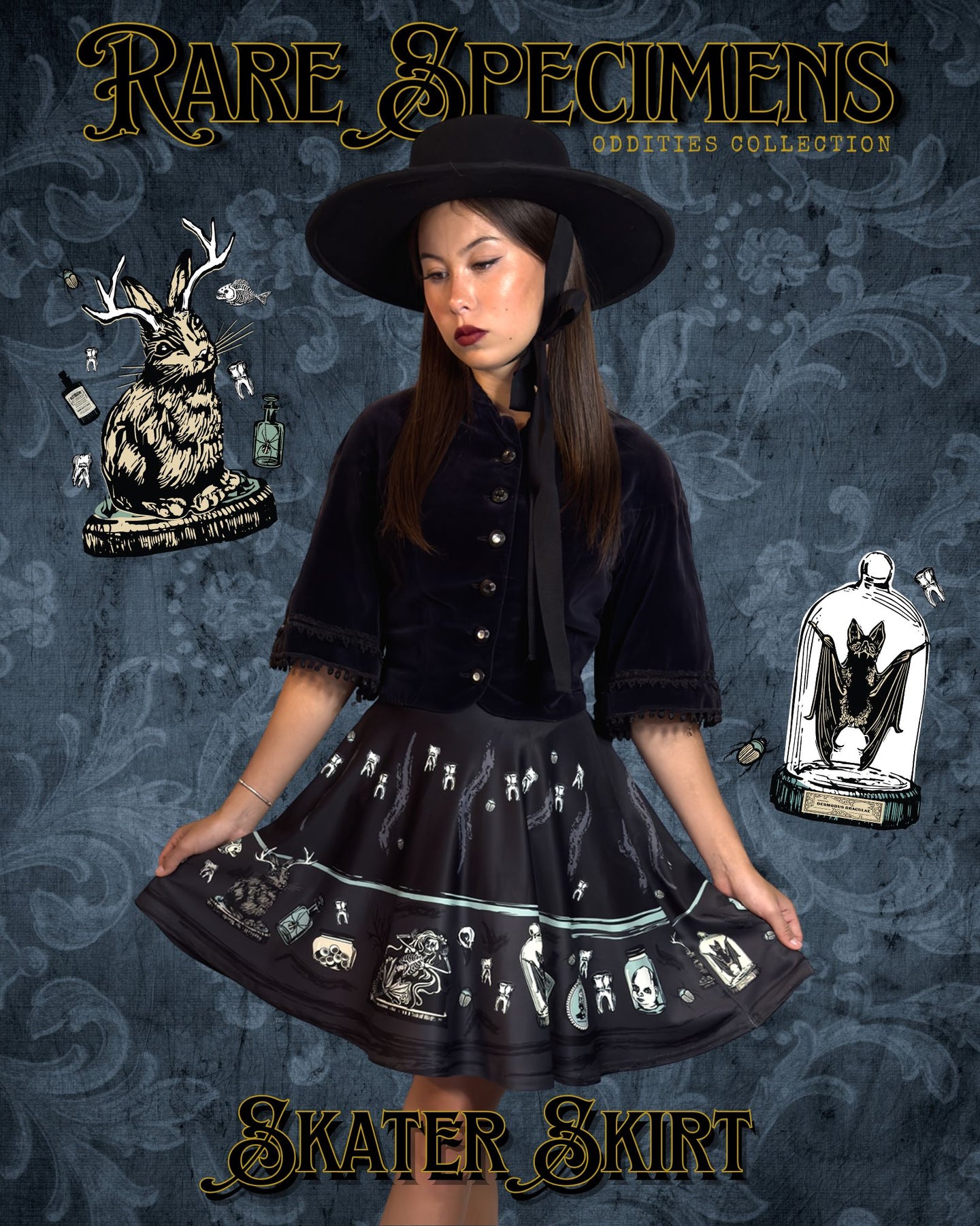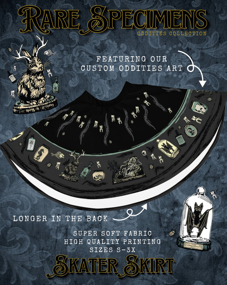 Our love for the odd and unusual has been translated into this fun skater skirt! Featuring art from our Rare Specimens collection. This skirt has all the weird oddities that you love along the border with teeth and colored brush strokes to give it a very hand drawn look.