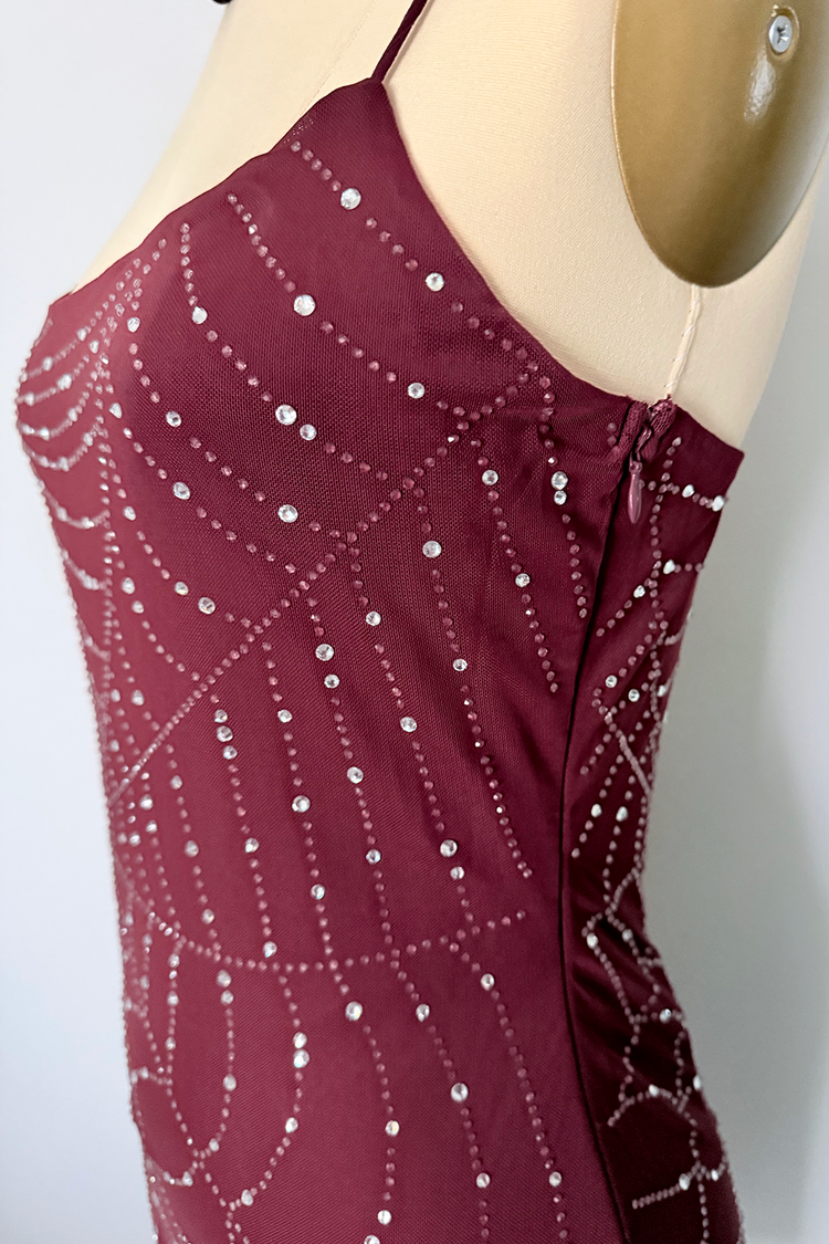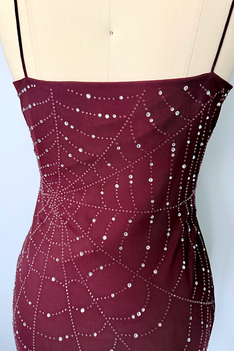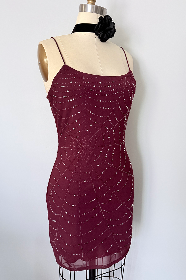 Our new Sparkly Spiderweb dress just arrived and she's just perfect for the holidays! Featuring burgundy wine mesh with super sparkly rhinestones in the shape of a spiderweb on the front and back! She has spaghetti straps and a side zipper plus she's lined.  This is a mini dress and she's stretchy. Please check the size chart before ordering.