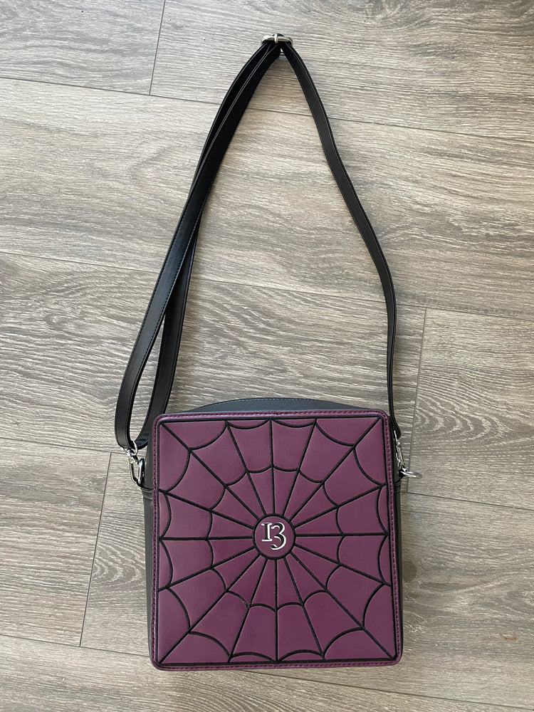 Based on the square spiderweb windows that Sarah Winchester strategically placed all over the Winchester, this crossbody features purple vinyl with black embroidered spiderweb art on the front and back. With a WMH Initial zipper pull In silvertone. The interior is custom printed with spiderweb lining.