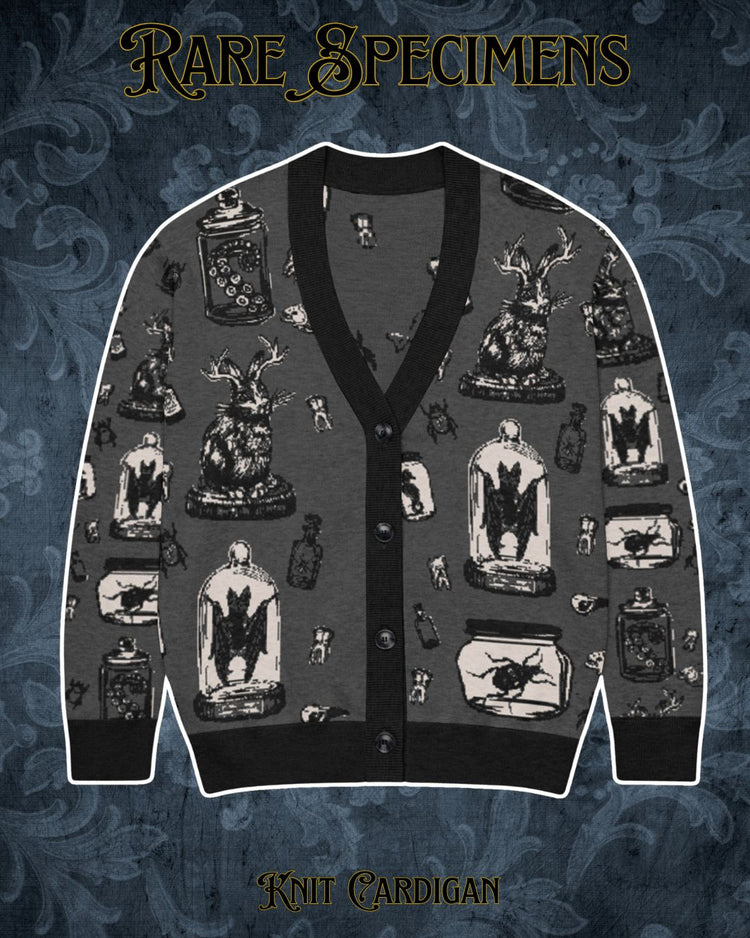 Rare Specimens Knit cardigan is our newest sweater design! Featuring the custom art from our newest collection! Super soft knit cardigan with contrast details. This sweater runs BIG!