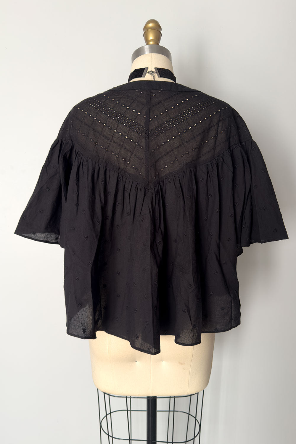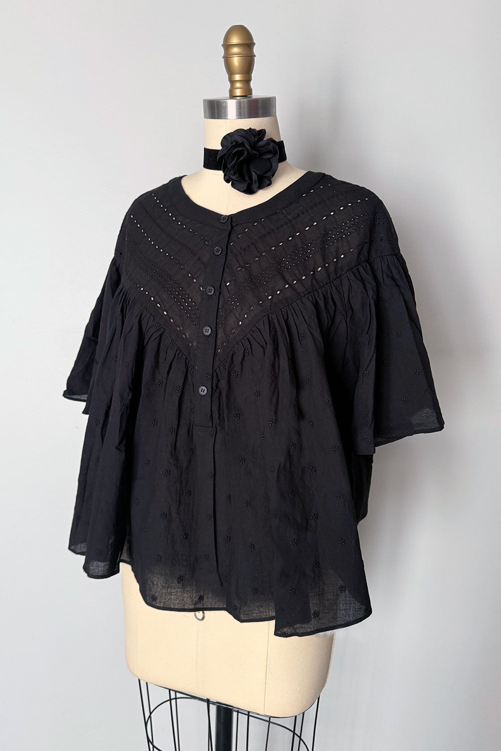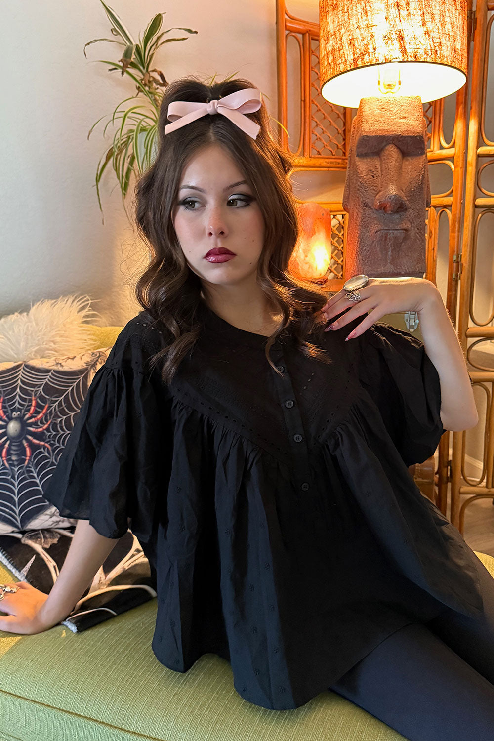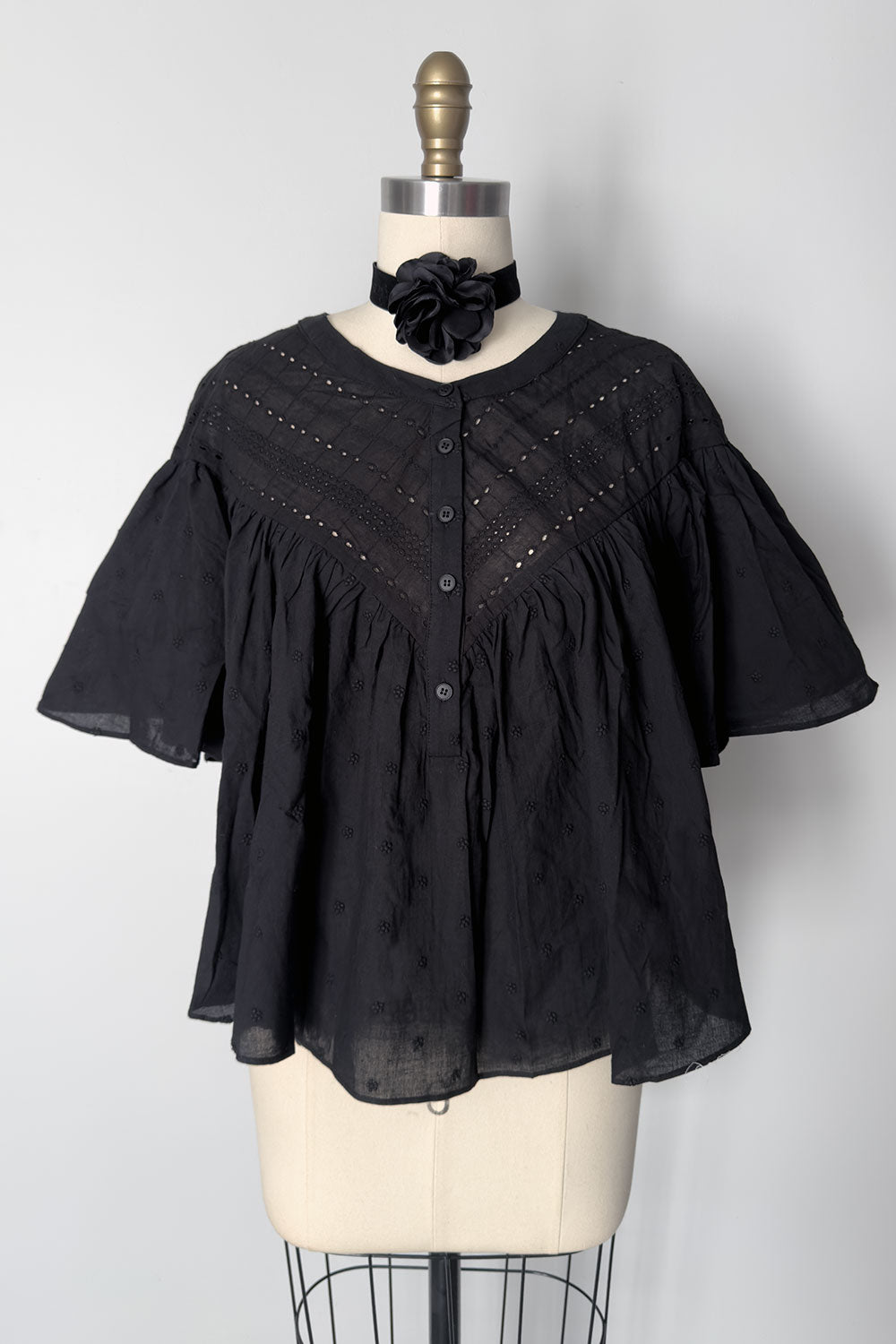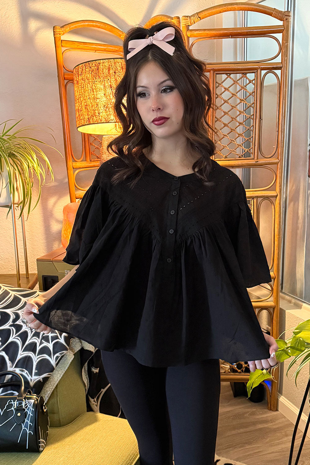 Unleash your inner romantic with our delicate white cotton eyelette babydoll top! Featuring lightweight cotton fabric with trapeze style sleeves and bodice. Very open sizing on this cute top!