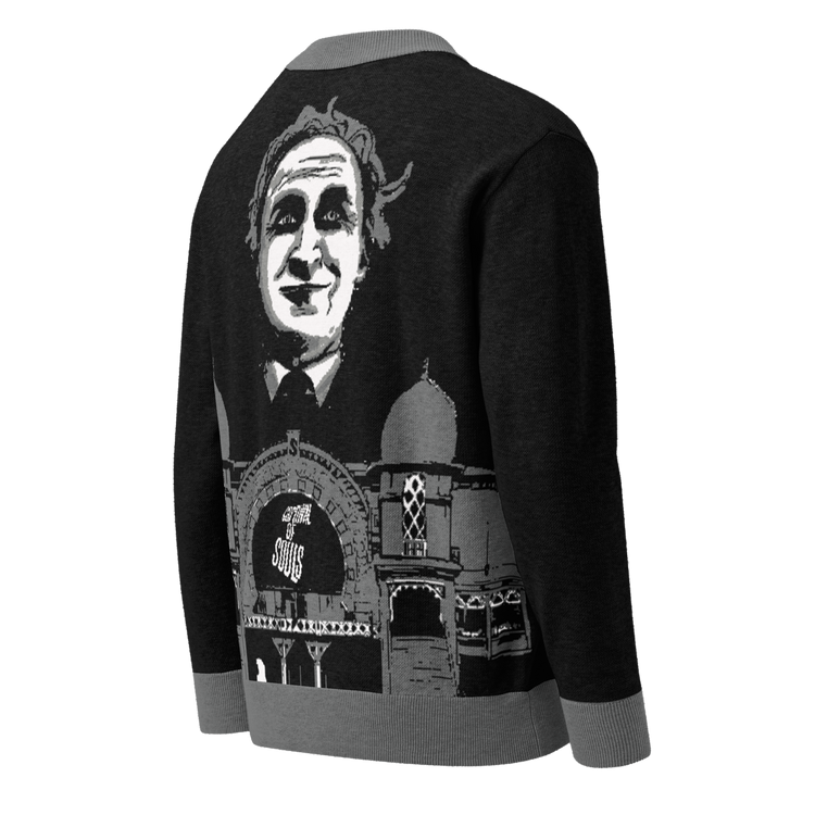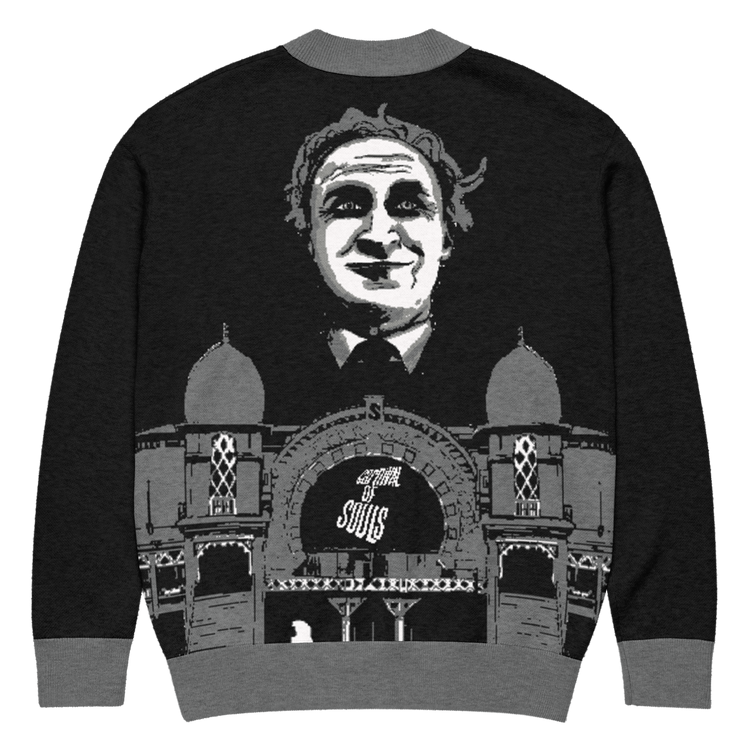 Stay cozy with our new Carnival of Souls knit cardigan! This fab cardigan is so soft and comfy - perfect for long walks on the beach at the carnival! Featuring the logo on the front along with The Ghoul and the legendary Saltair building on the back. Black knit with grey contrast details. This sweater runs big so size down for a tighter fit.