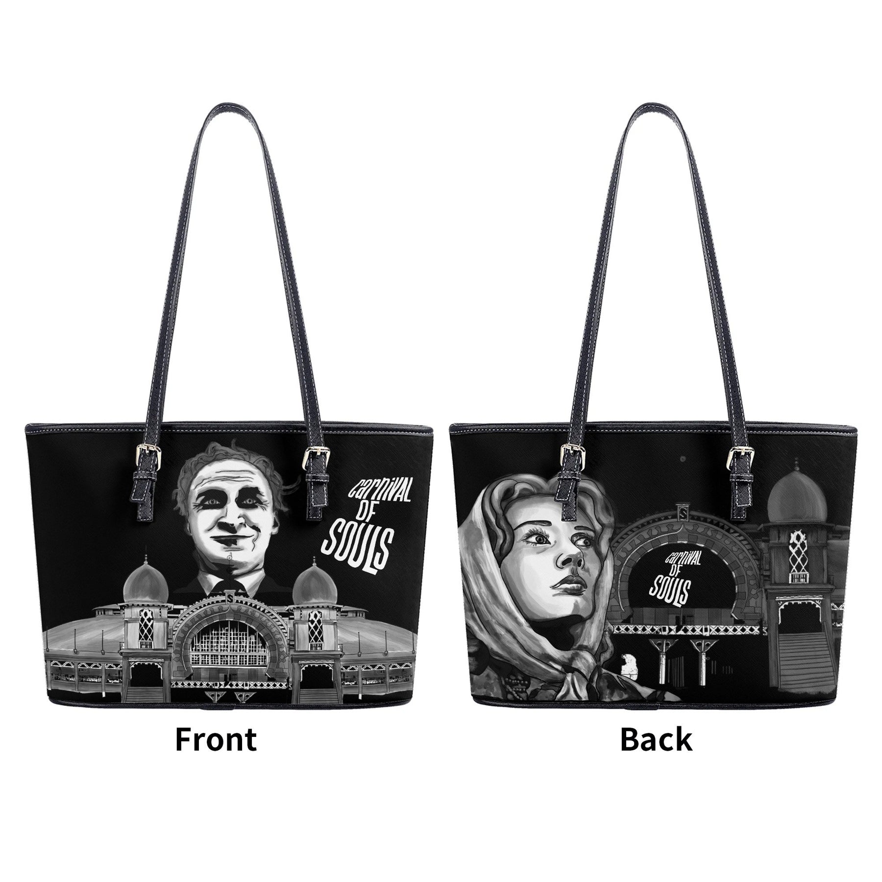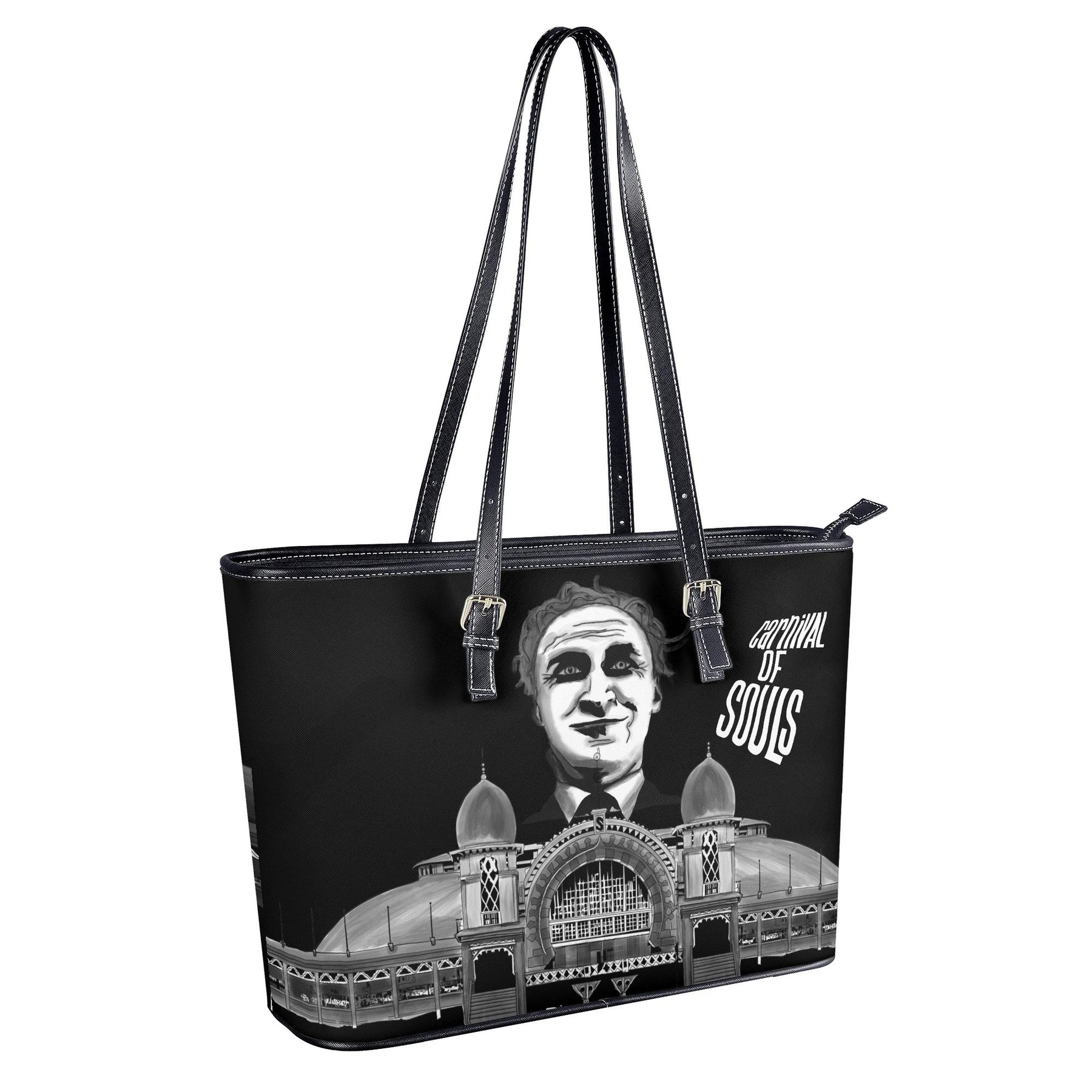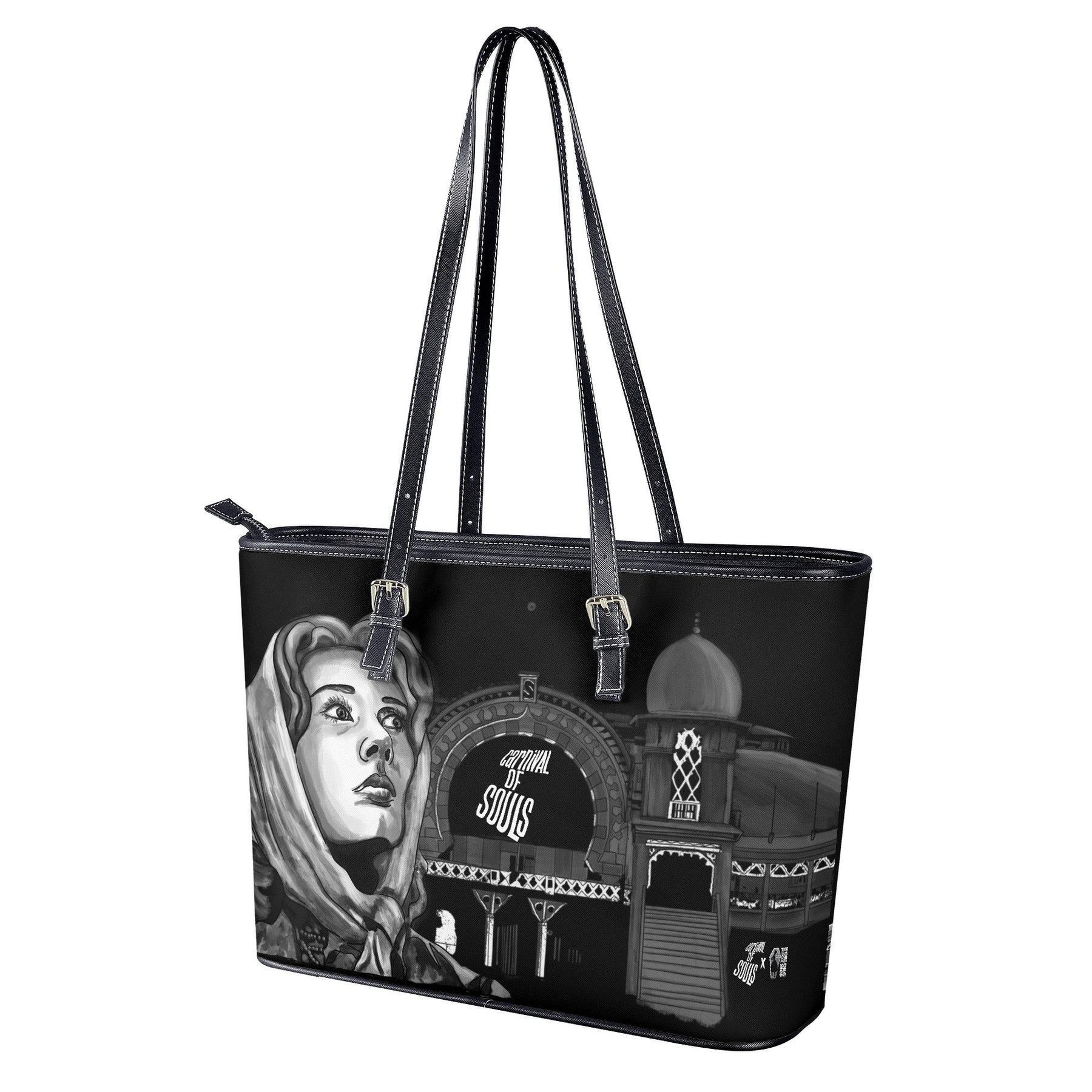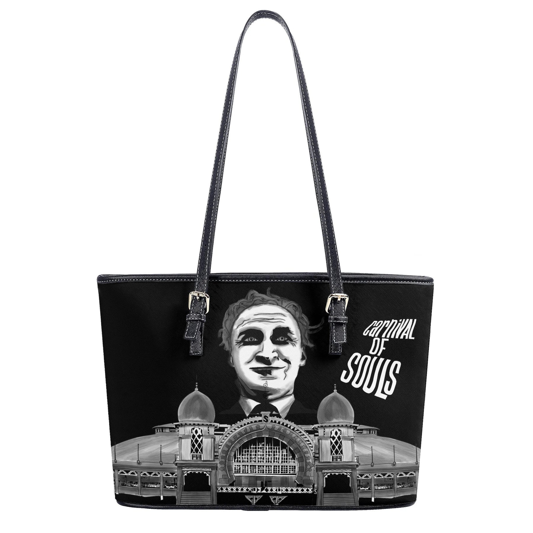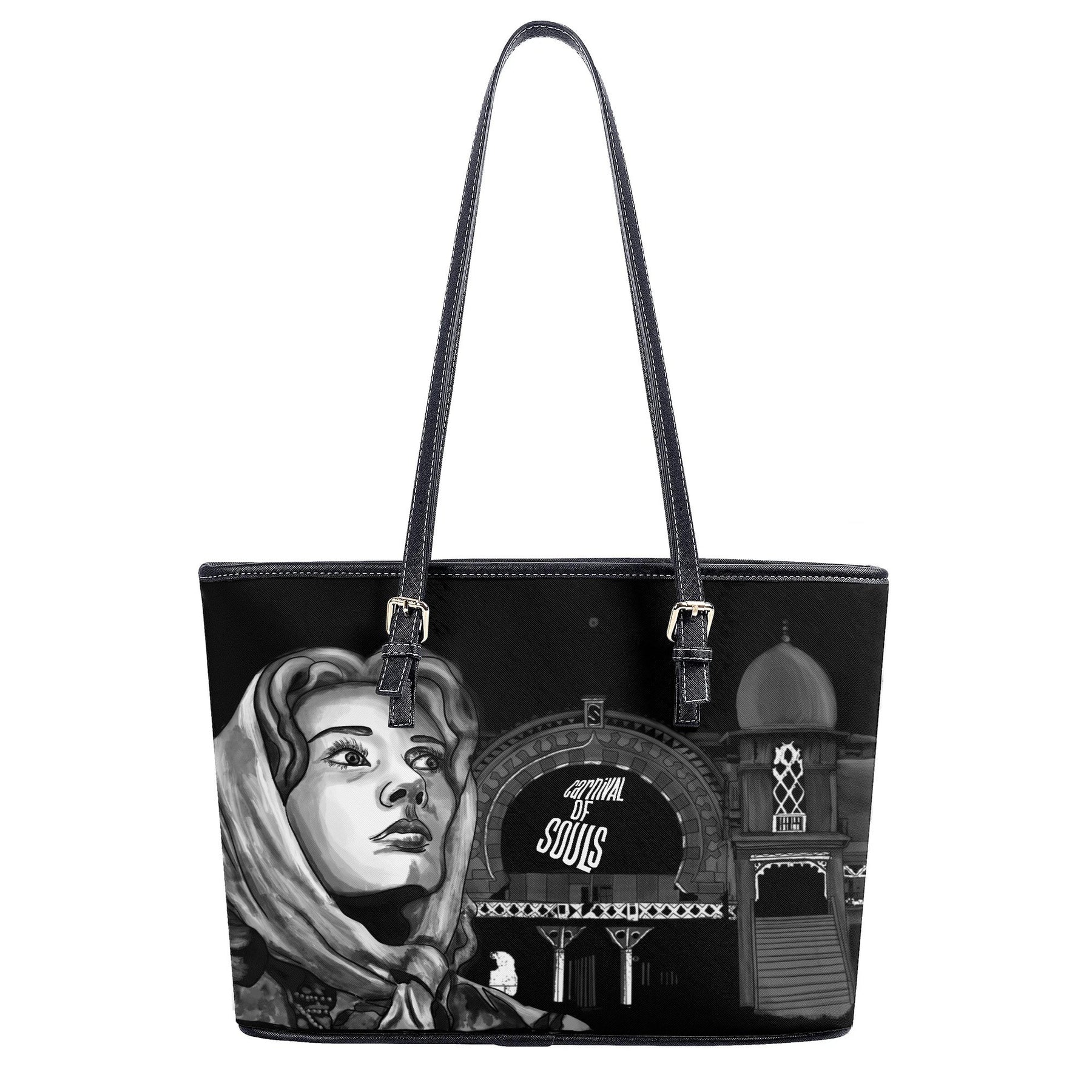 Our new Carnival of Souls tote bag is not your typical tote! Featuring PU leather with adjustable straps and top zipper. This bag can fit all your spooky things! Available in 2 sizes. Medium or Large.