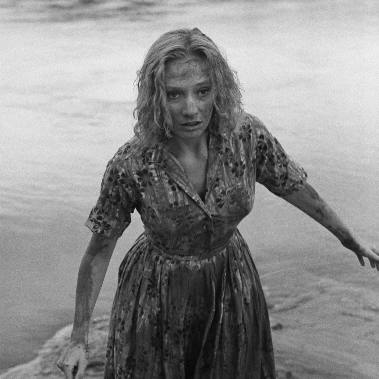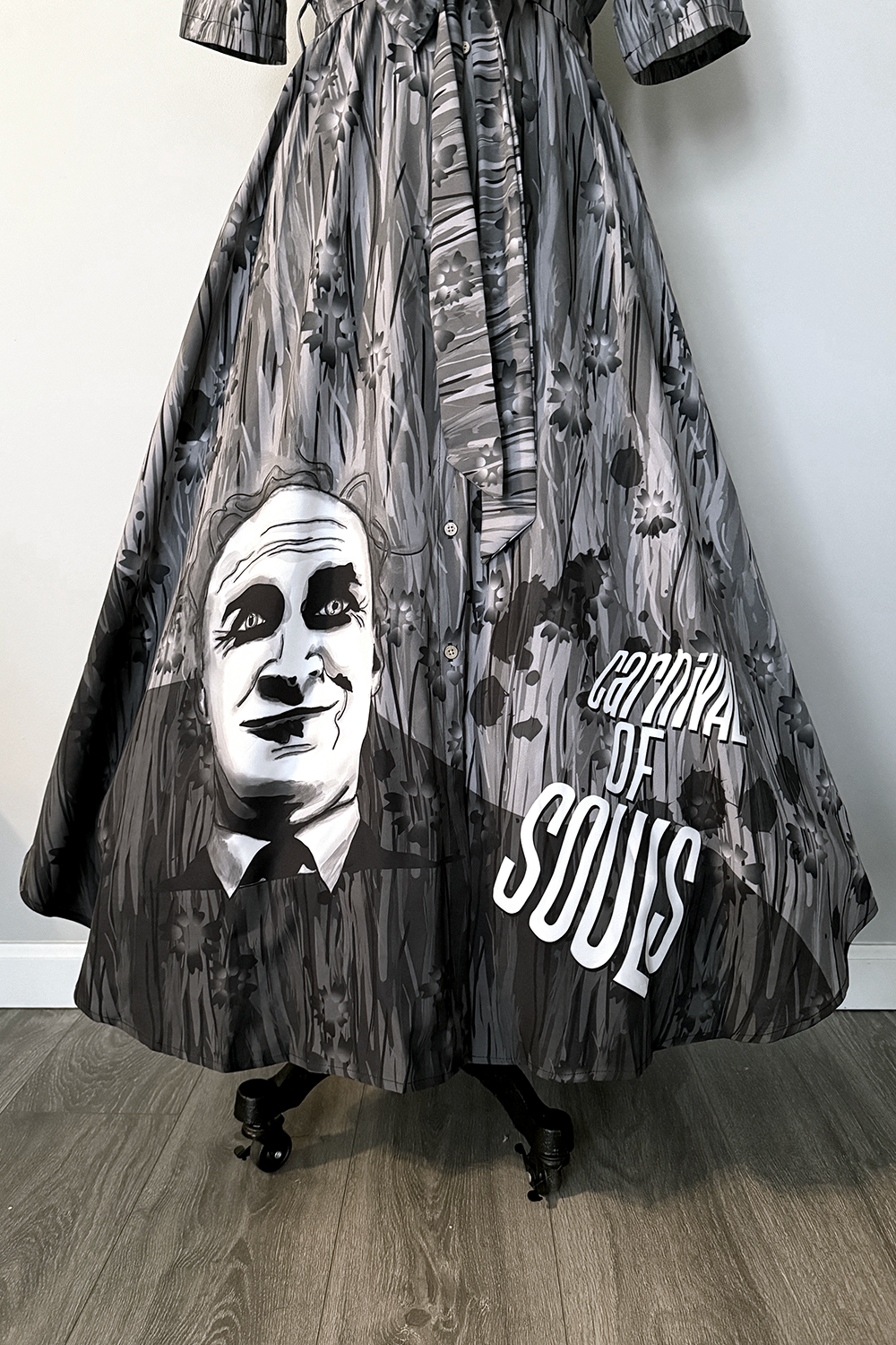This shirt dress is a reproduction print of the dress that Mary was wearing when she came out of the water after her car fell in. Featuring a grey and black floral print with mud stains along the bottom and the Ghoul's face along with the logo across the bottom.