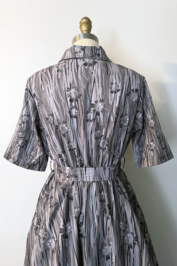 This dress is a little longer than a midi dress. She buttons all the way down the front with a matching waist tie.