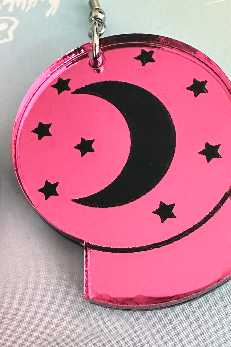 Conjour the spirits with these fun crystal ball earrings! Featuring pink mirror acrylic with black details.