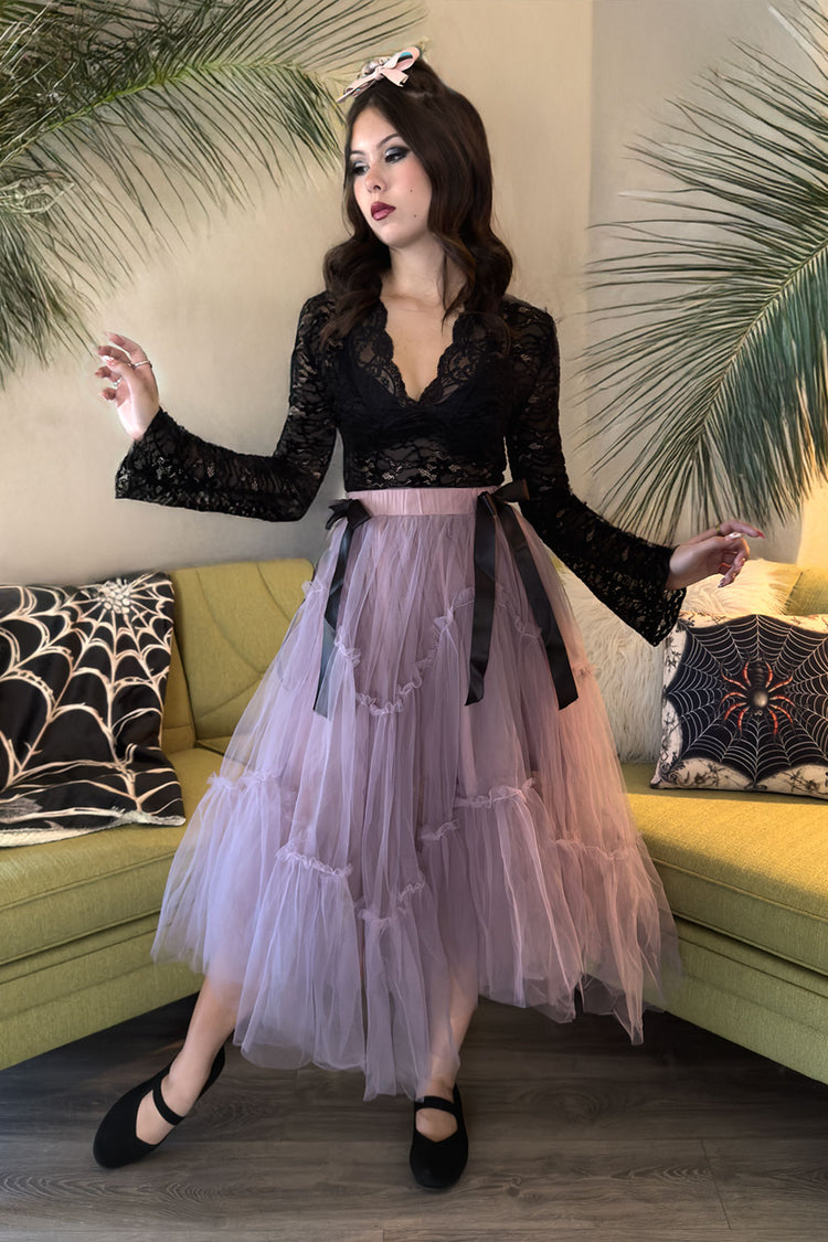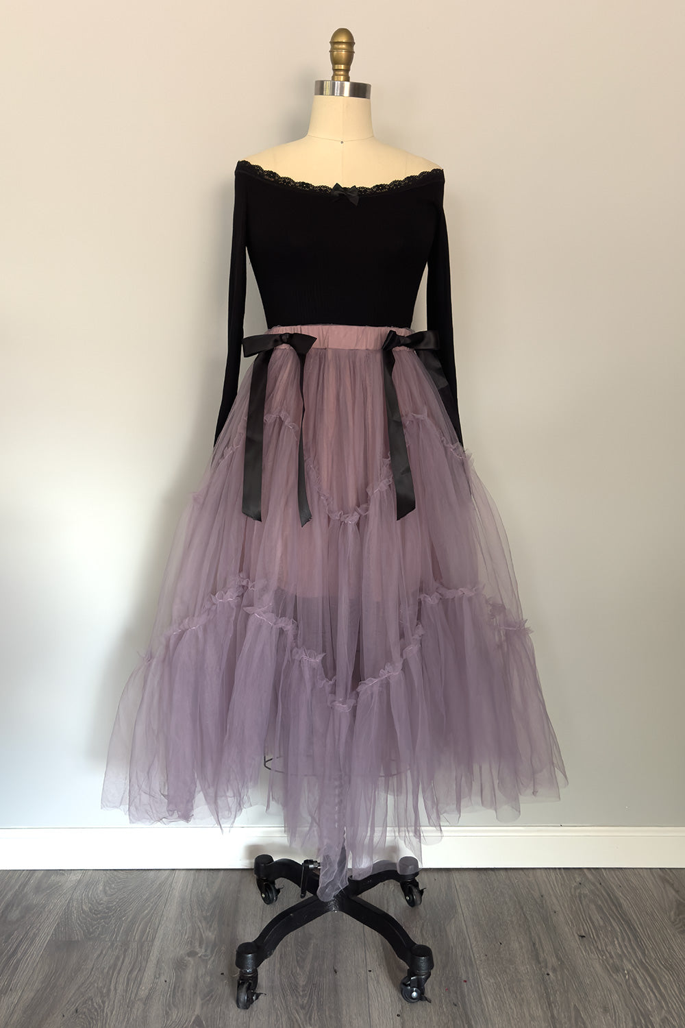 You'll be the most magical fairy goth-mother in our stunning tulle skirt! Featuring a dusty lavender tulle skirt with cute black bows on the front. This skirt is mid calf length and has a matching lining. Elastic waistband.