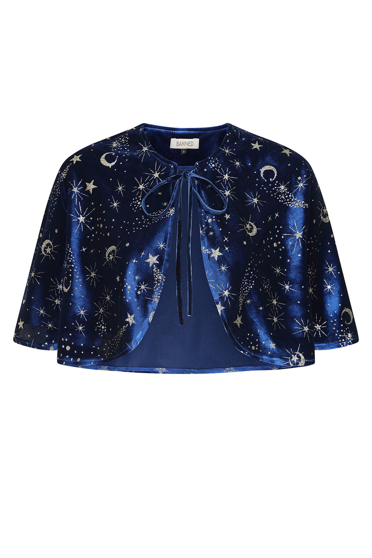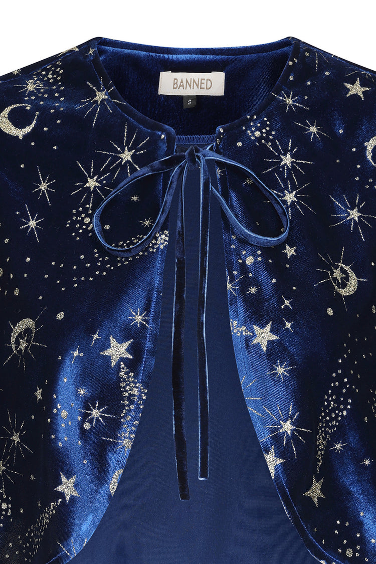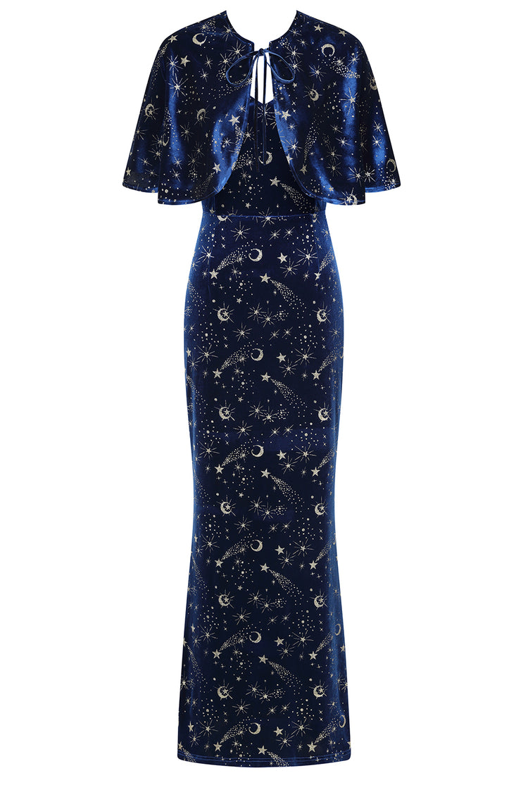 This stunning dress features luscious dark blue velvet with silver celestial print on a stunning silhouette. She comes with a matching shoulder cape that ties in the front.