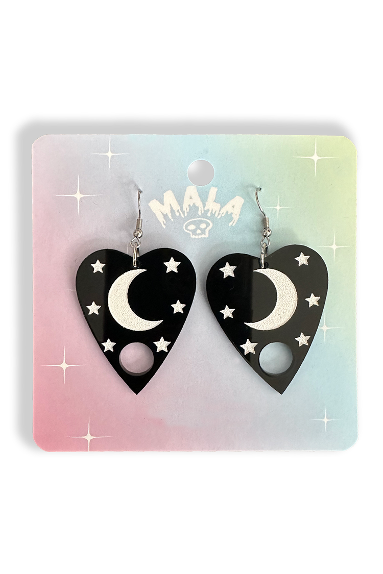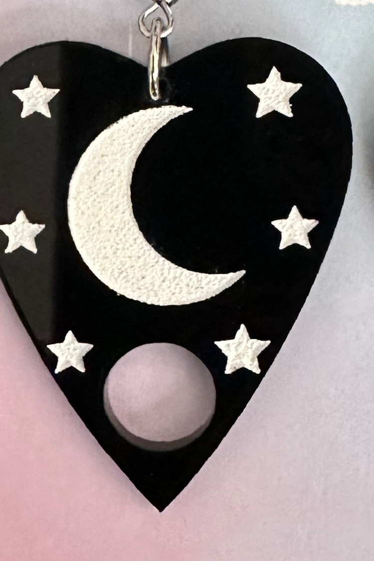 These spellbinding earrings feature a black planchette shape with moon and stars engraved in white.