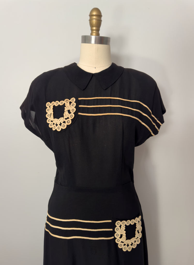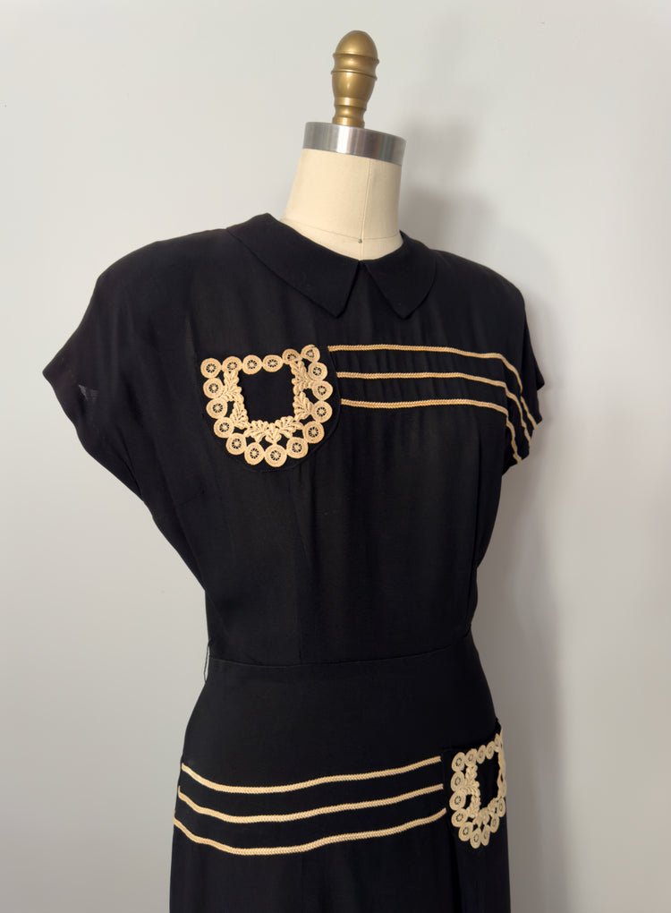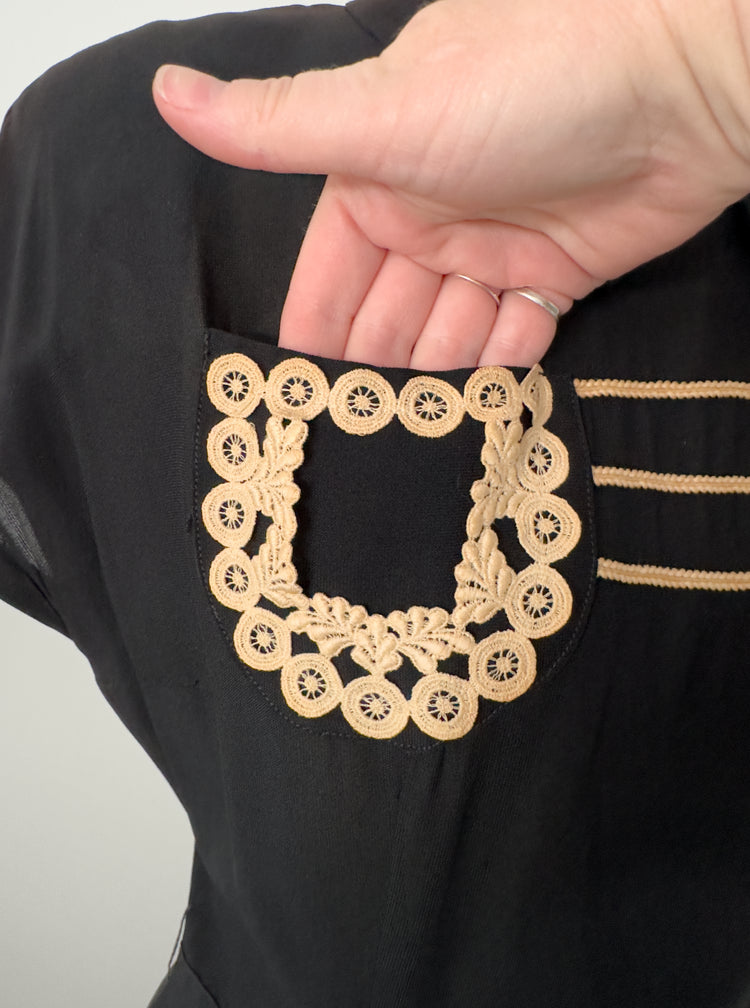True Vintage 1930's Black Dress with Lace Pocket Details - FINAL SALE