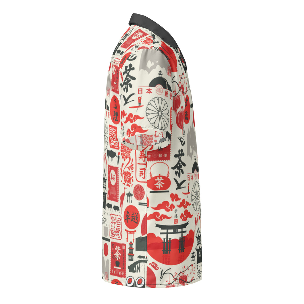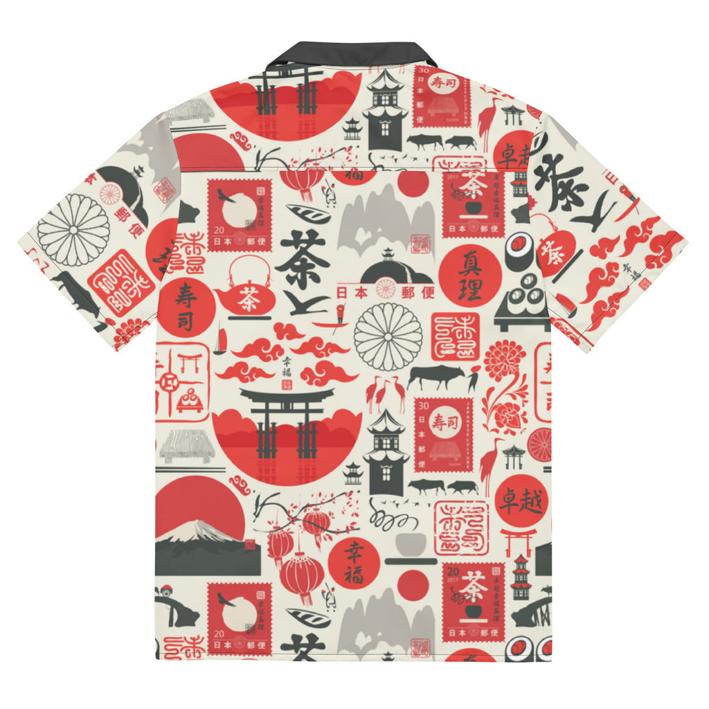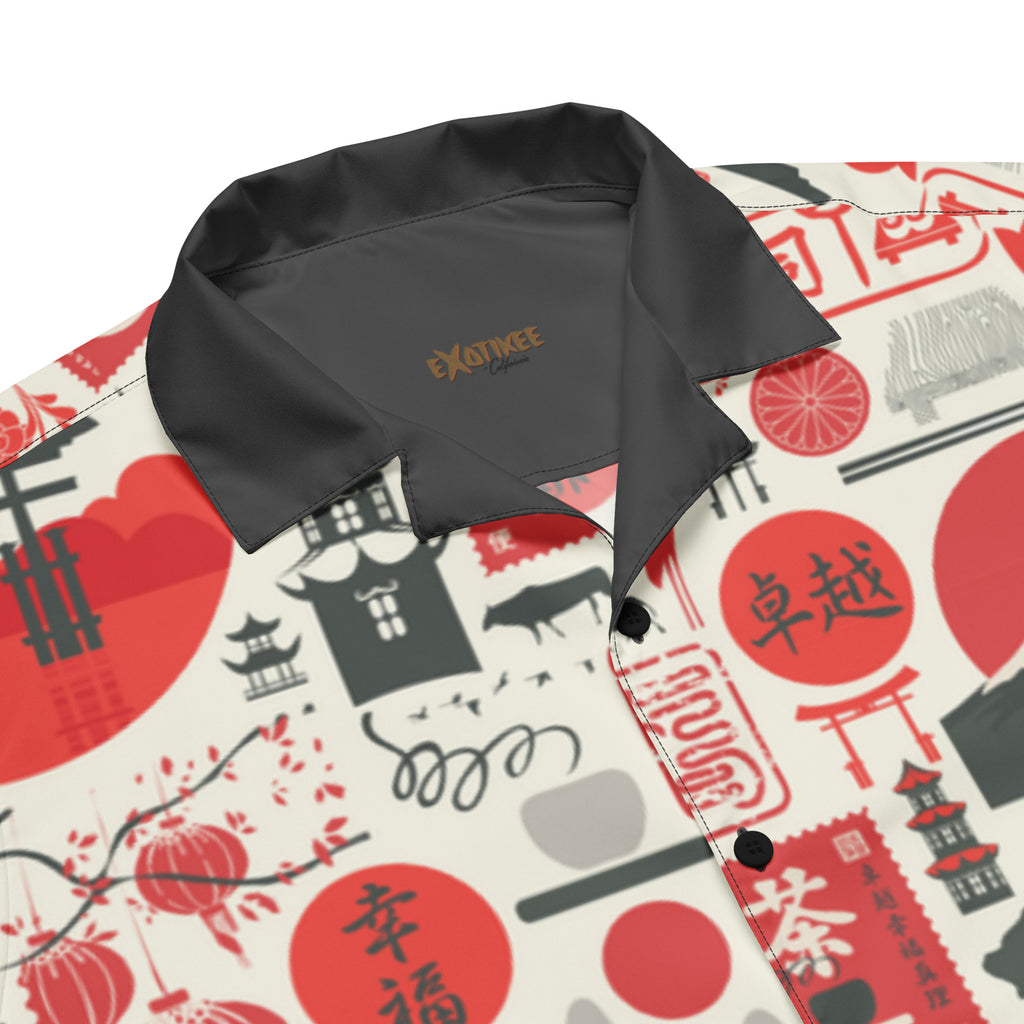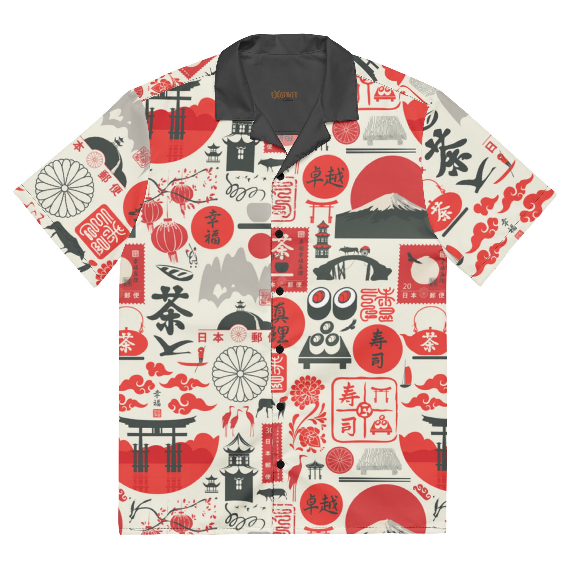This fun button down features an all over sushi inspired print in red, dark grey and off white. With a contrast collar, this shirt is perfect for any tiki event.