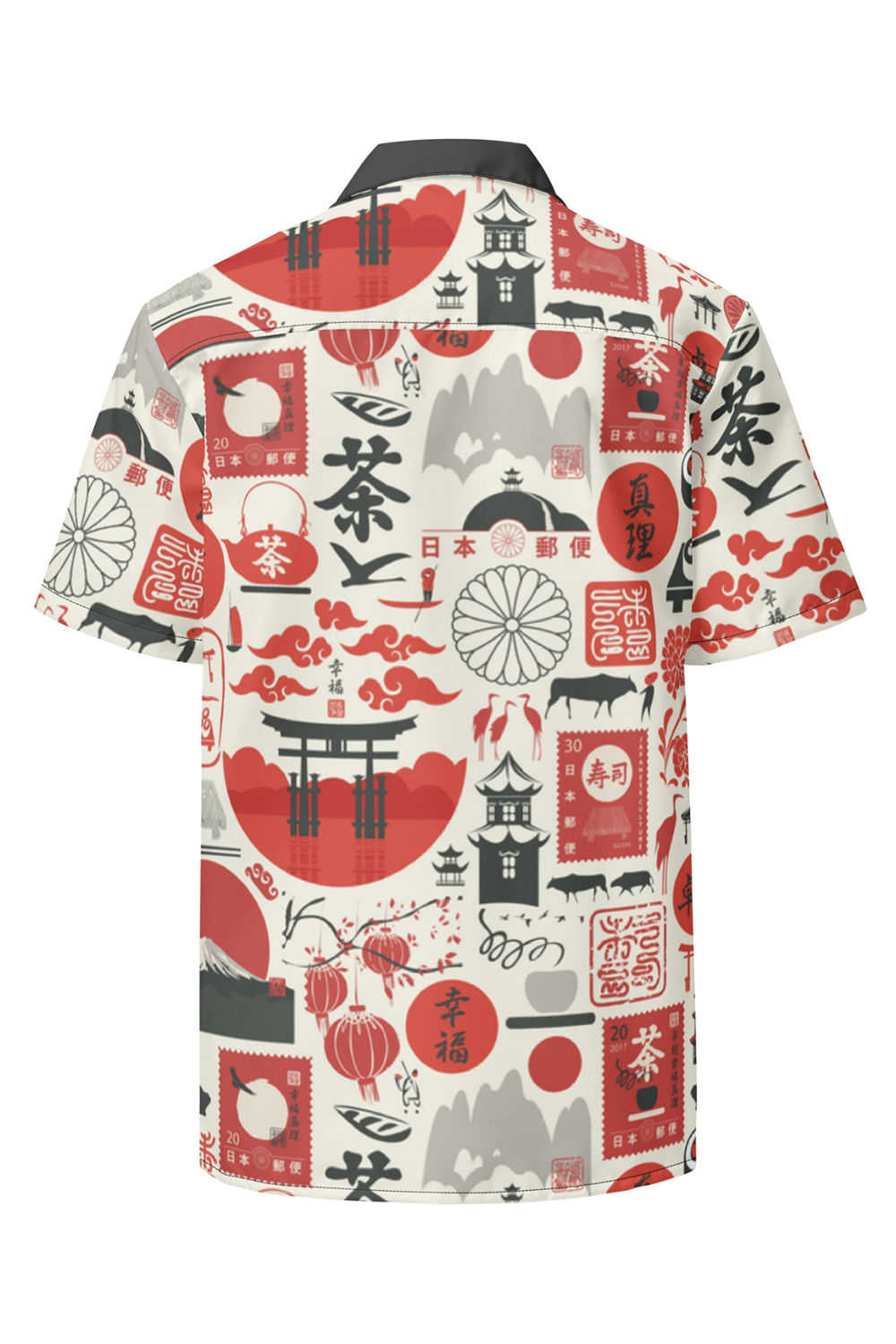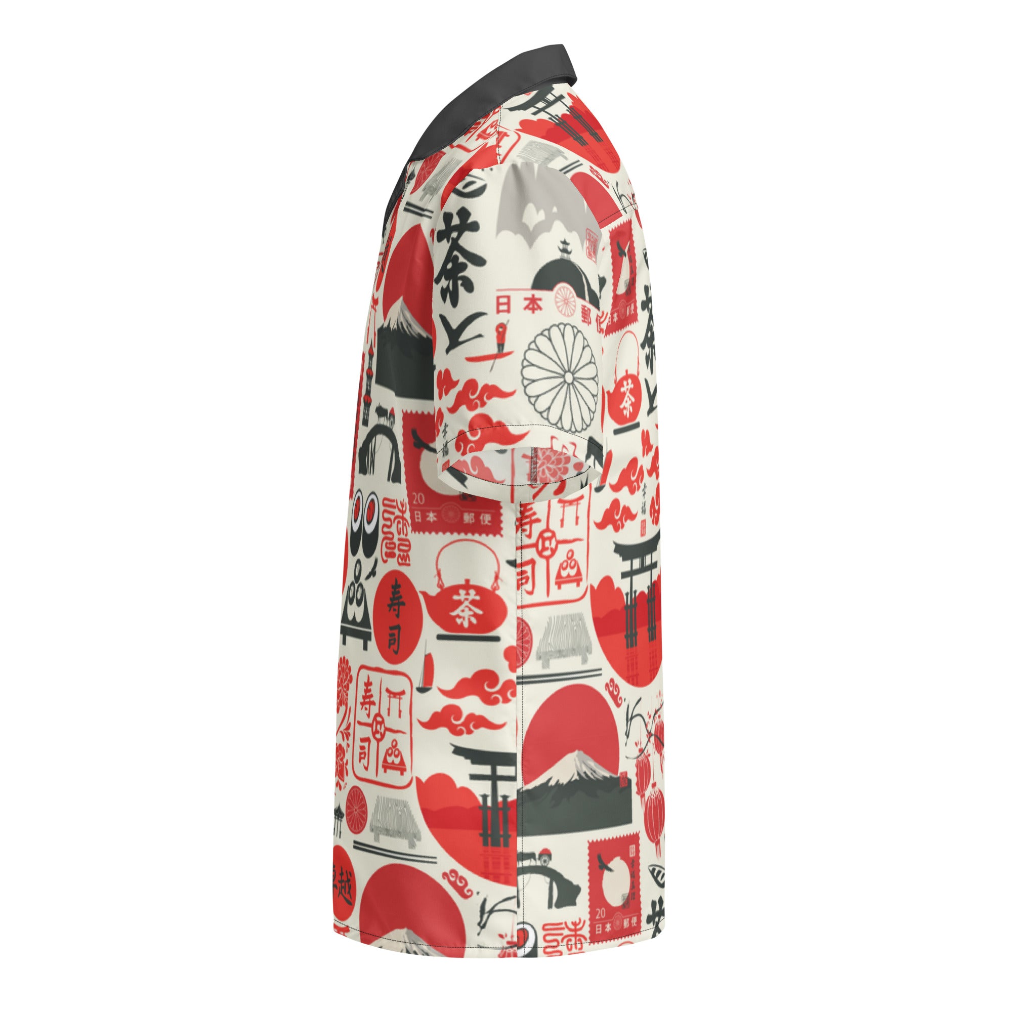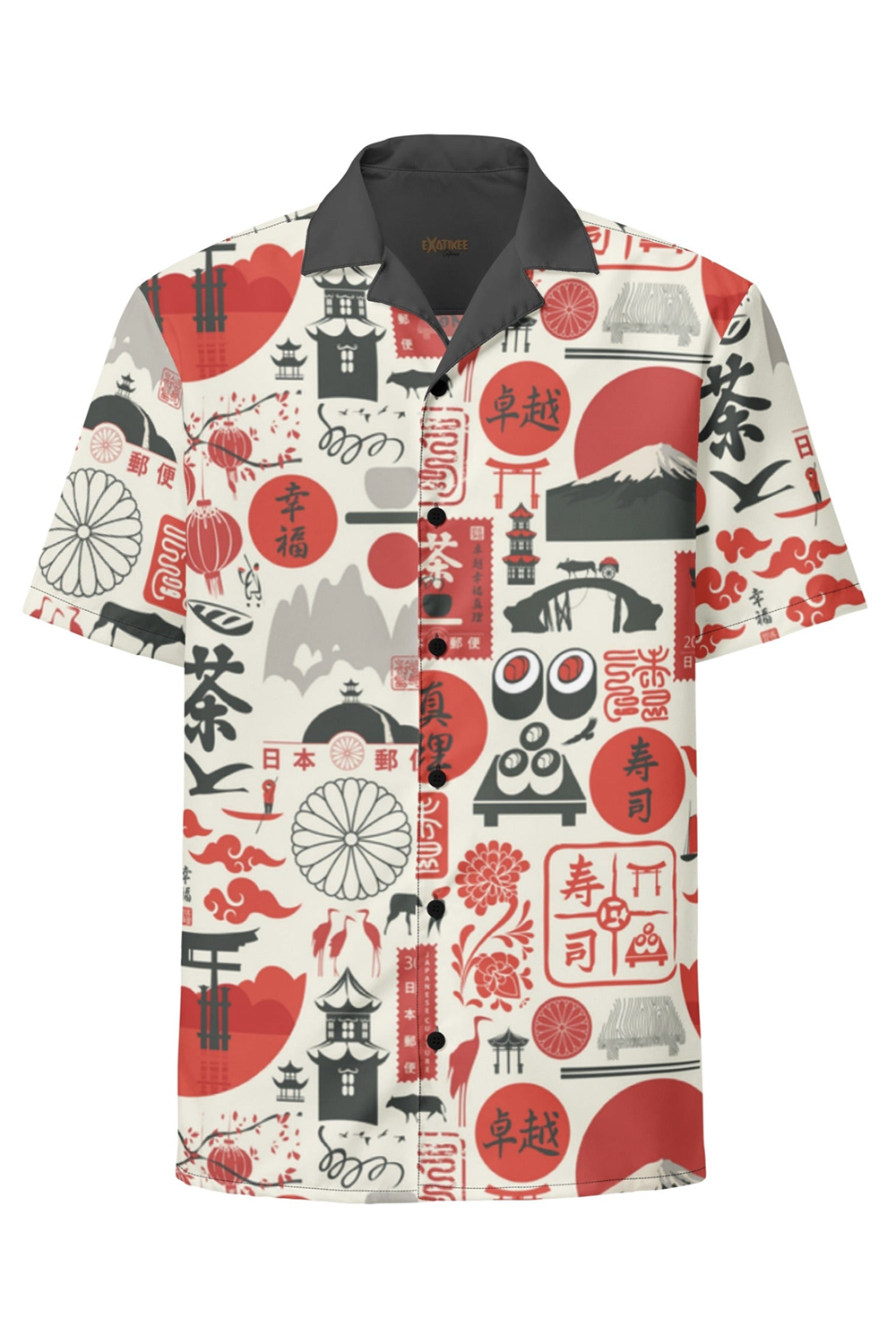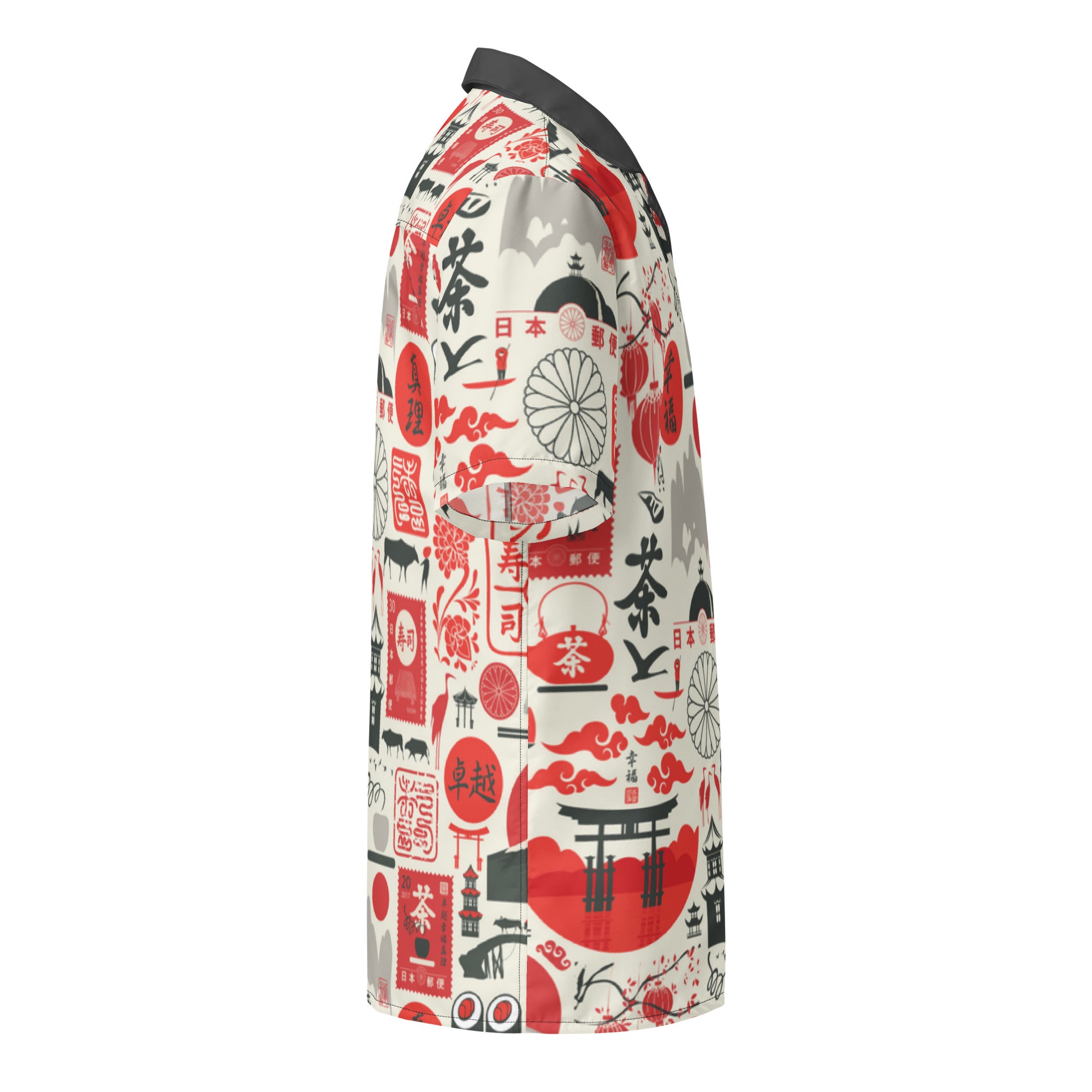 This fun button down features an all over sushi inspired print in red, dark grey and off white. With a contrast collar, this shirt is perfect for any tiki event.