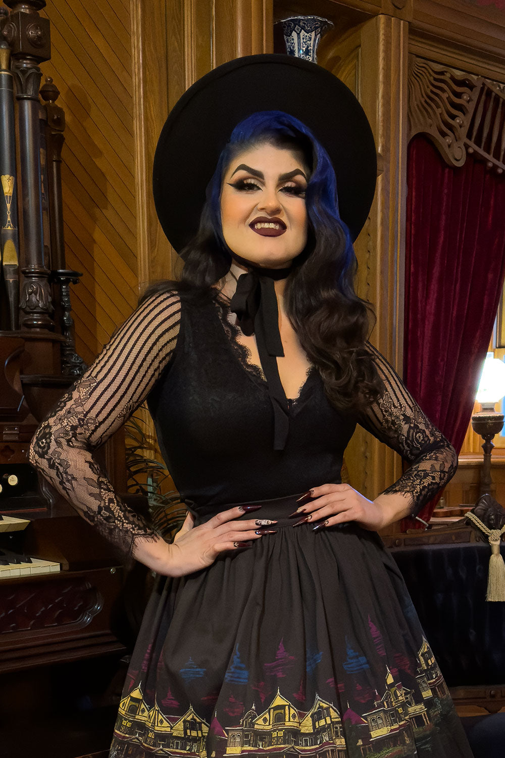 Behold the vintage glamour of our Victorian-style lace top, delightfully designed to go with our one-of-a-kind novelty skirts. It's the perfect gothic piece, with intricate lacy sleeves and an ultra-flattering V-neckline. Plus, with its stretchy lace, this top is as comfy as it is chic!