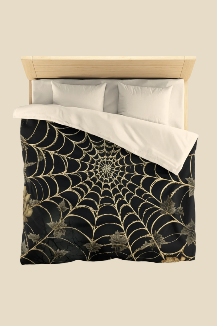 Complete your moody decor aesthetic with our vintage web print duvet cover, available in 2 sizes! Stunning cream spiderweb print on a black background with a cream back.