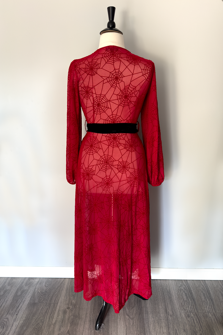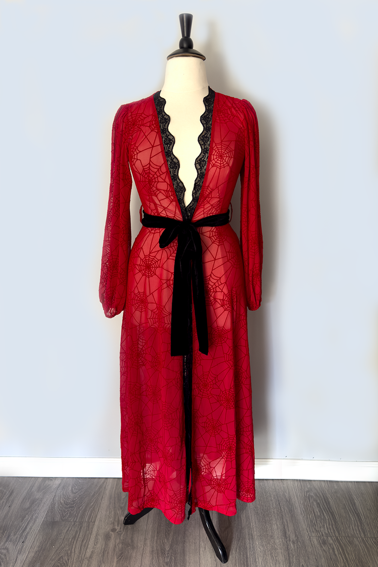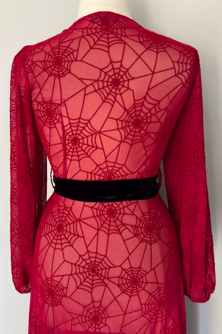 This duster's victorian vibes will have you spinning webs of nostalgia. Our red burnout velvet spiderwebs on red mesh fabric and lace trim–complete with a black velvet tie belt and hook and eye closure–keep your style looking spooky as can be! Stretchy and size-inclusive, this look is perfect to style over a slip or leggings.